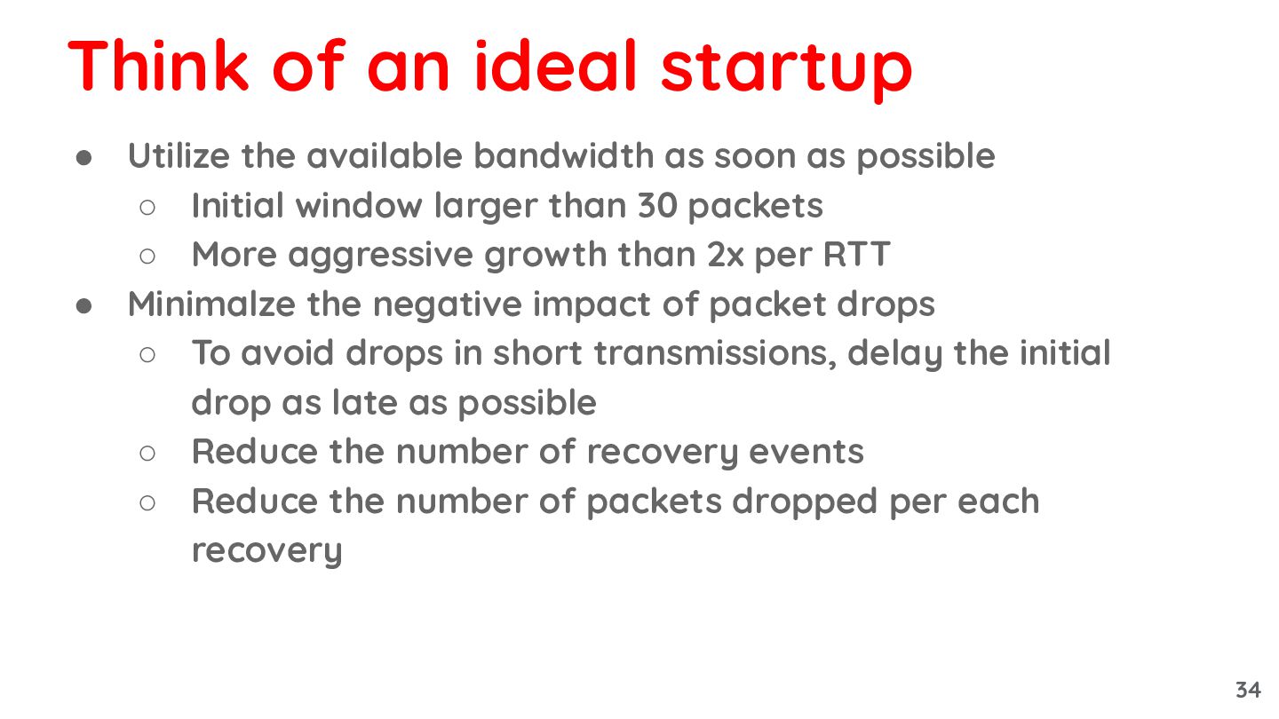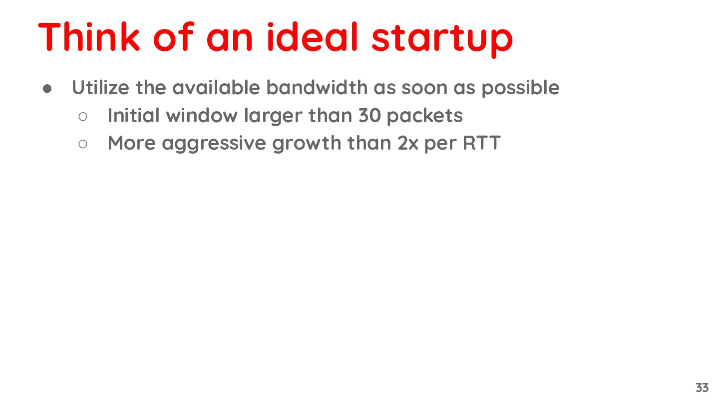 Initial window larger than 30 packets ◦ More aggressive growth than 2x per RTT Think of an ideal startup 33