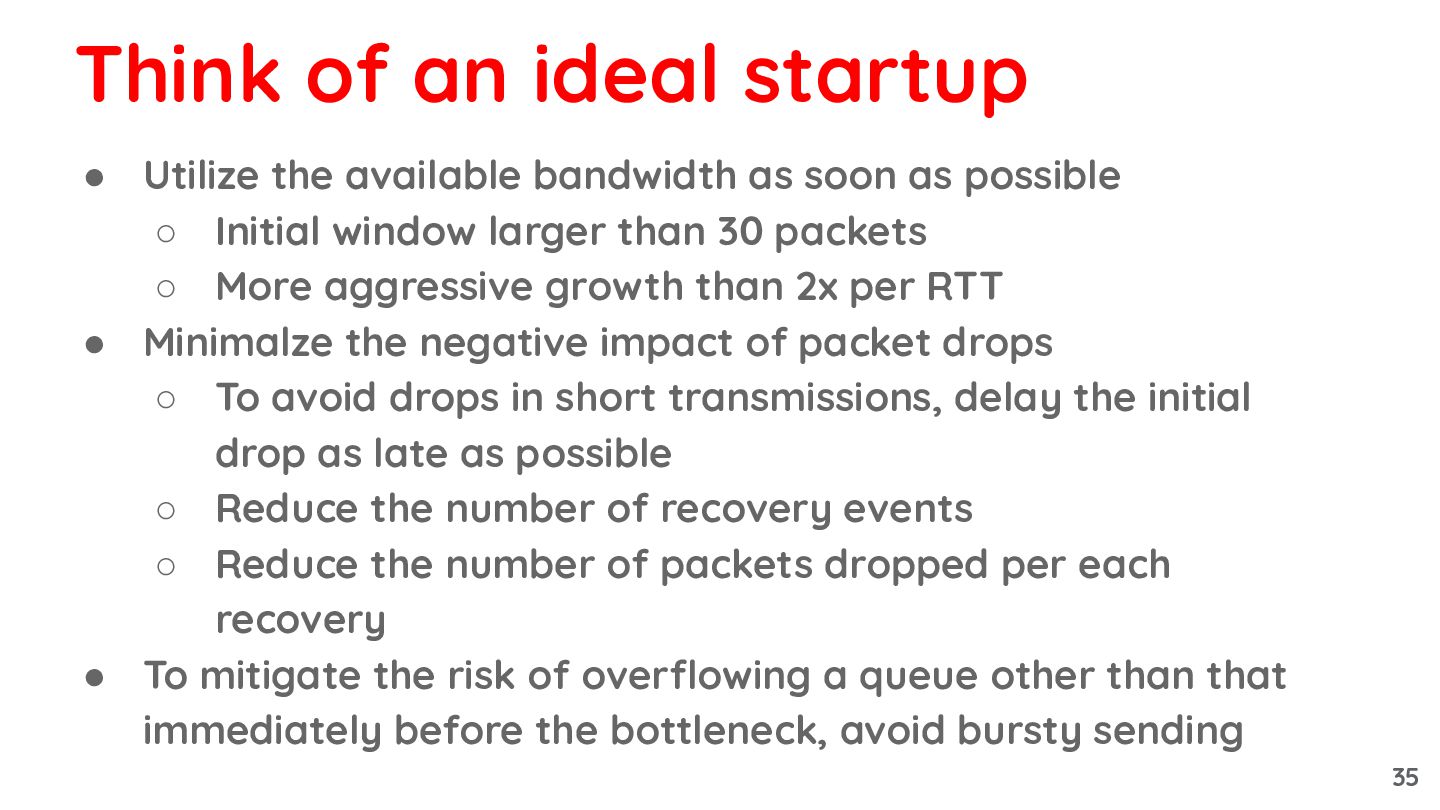 Initial window larger than 30 packets ◦ More aggressive growth than 2x per RTT • Minimalze the negative impact of packet drops ◦ To avoid drops in short transmissions, delay the initial drop as late as possible ◦ Reduce the number of recovery events ◦ Reduce the number of packets dropped per each recovery Think of an ideal startup 34