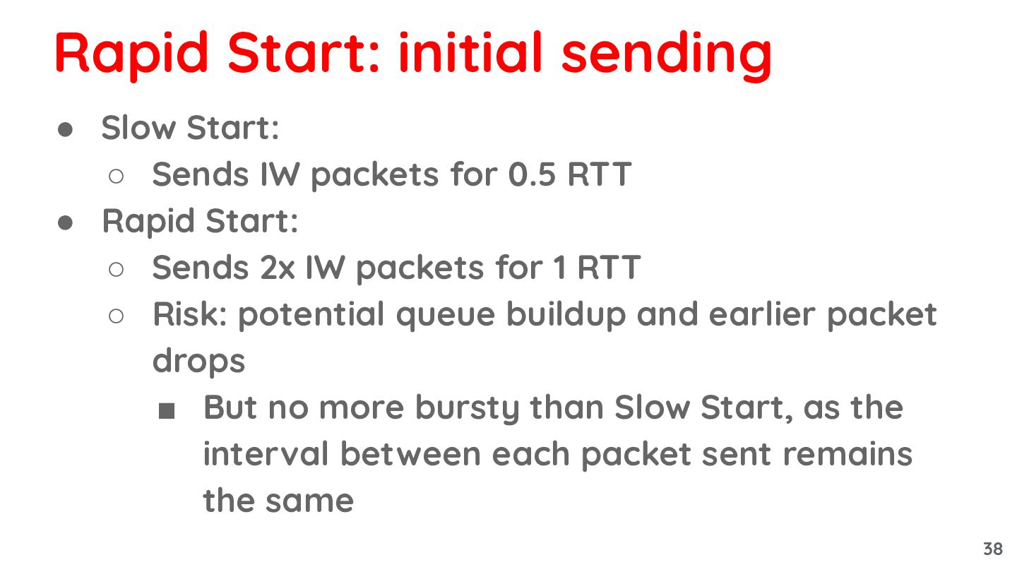 • Rapid Start: ◦ Sends 2x IW packets for 1 RTT ◦ Risk: potential queue buildup and earlier packet drops ▪ But no more bursty than Slow Start, as the interval between each packet sent remains the same Rapid Start: initial sending 38