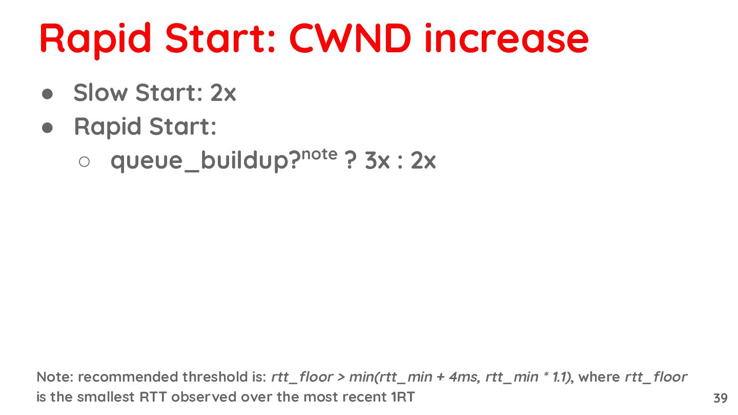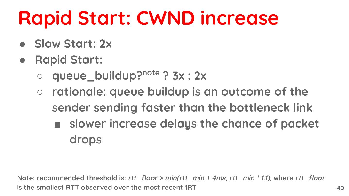 3x : 2x Note: recommended threshold is: rtt_floor > min(rtt_min + 4ms, rtt_min * 1.1), where rtt_floor is the smallest RTT observed over the most recent 1RT Rapid Start: CWND increase 39