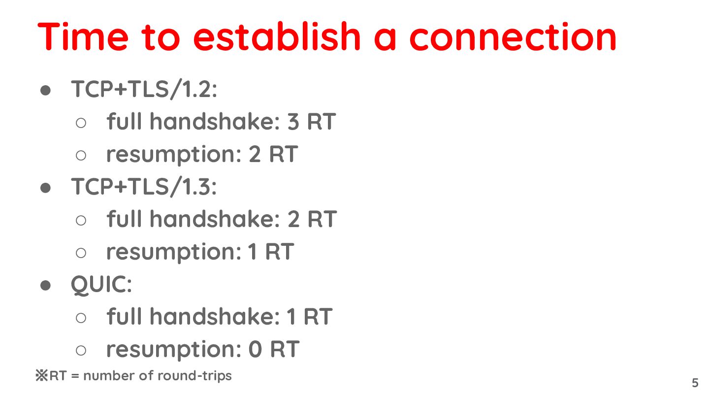 4. • TCP+TLS/1.2: ◦ full handshake: 3 RT ◦ resumption: 2