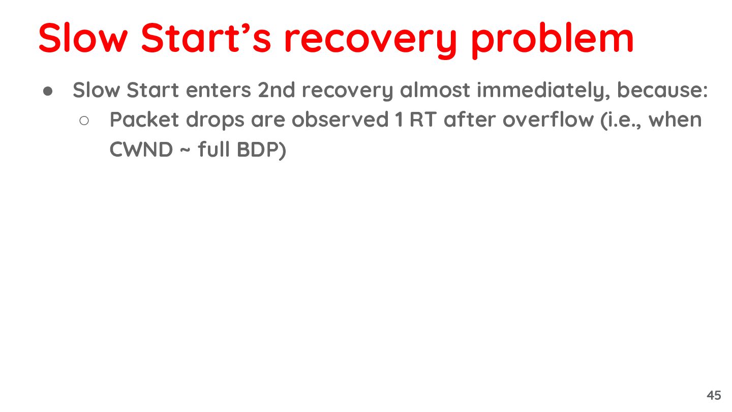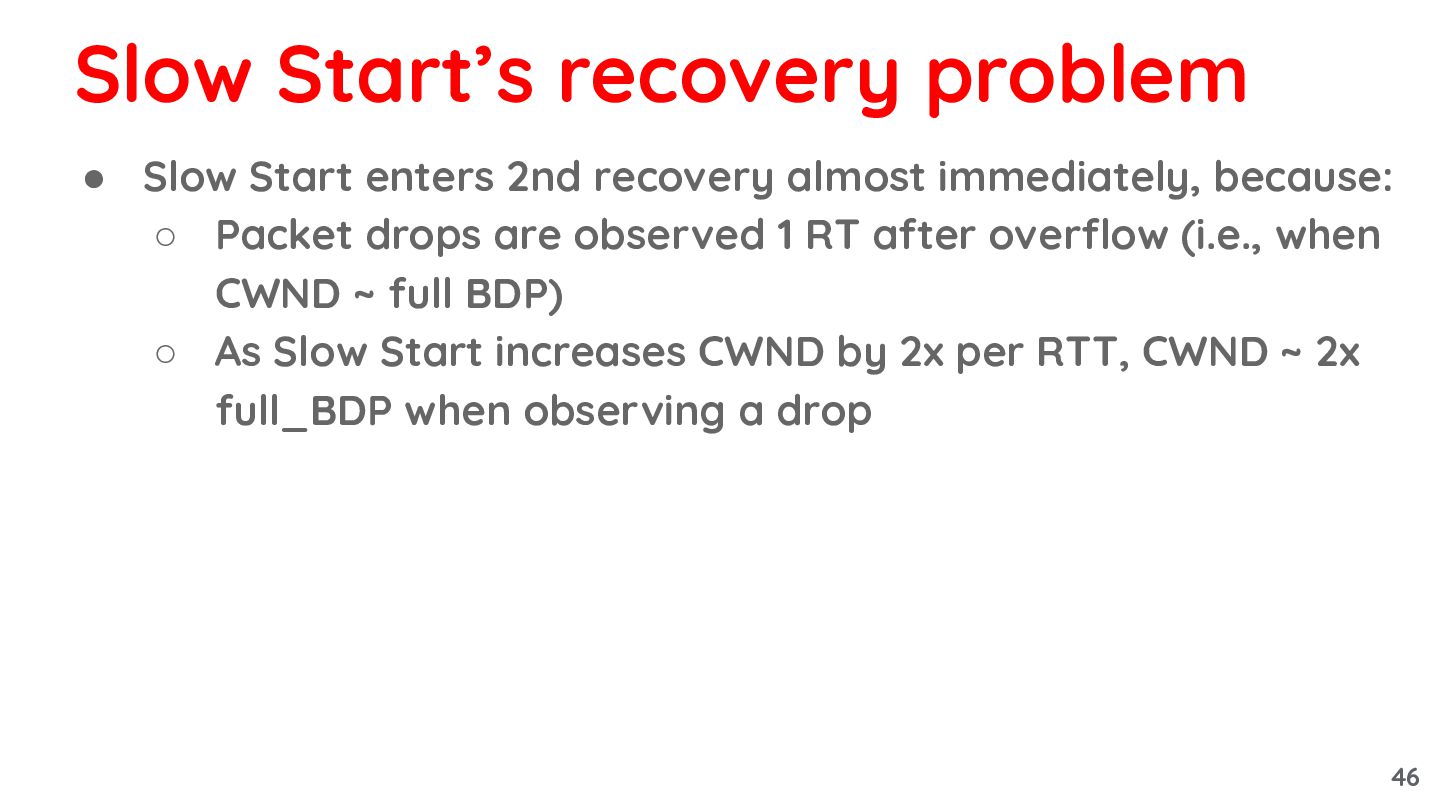 Packet drops are observed 1 RT after overflow (i.e., when CWND ~ full BDP) Slow Start’s recovery problem 45