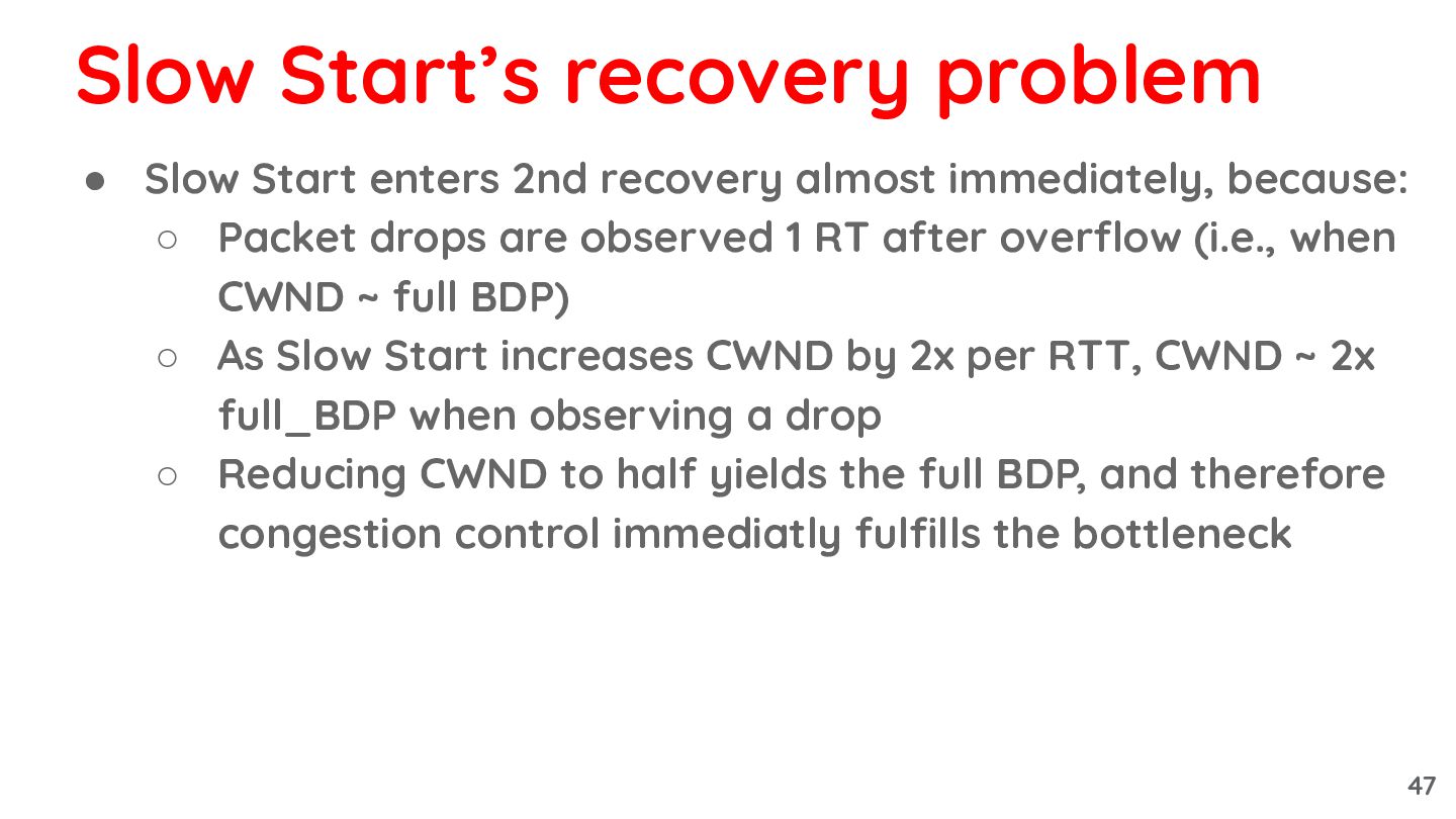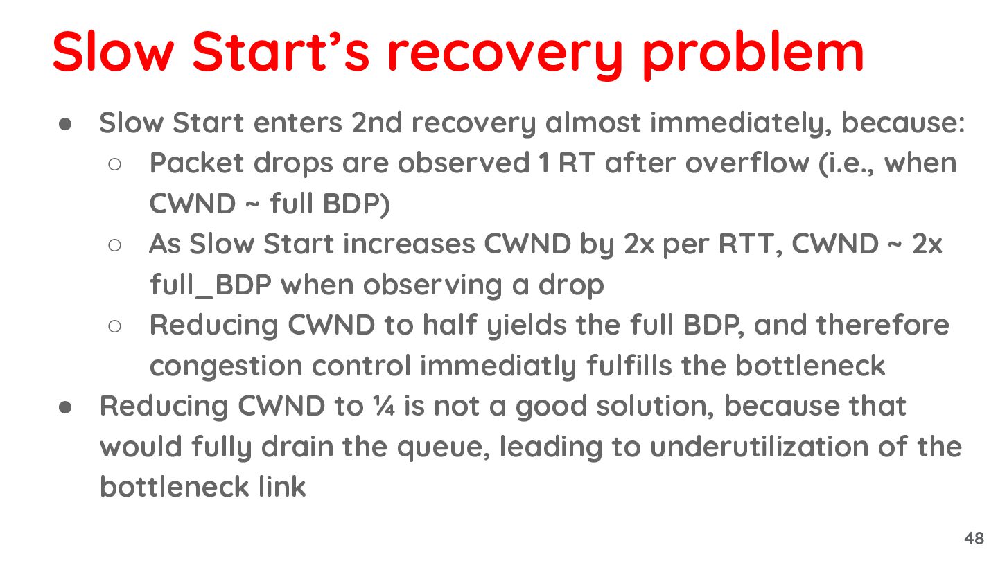 Packet drops are observed 1 RT after overflow (i.e., when CWND ~ full BDP) ◦ As Slow Start increases CWND by 2x per RTT, CWND ~ 2x full_BDP when observing a drop ◦ Reducing CWND to half yields the full BDP, and therefore congestion control immediatly fulfills the bottleneck Slow Start’s recovery problem 47