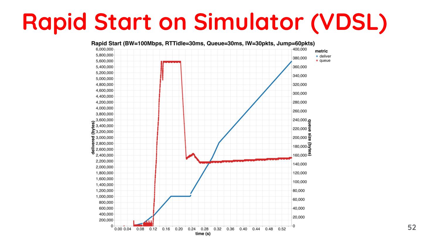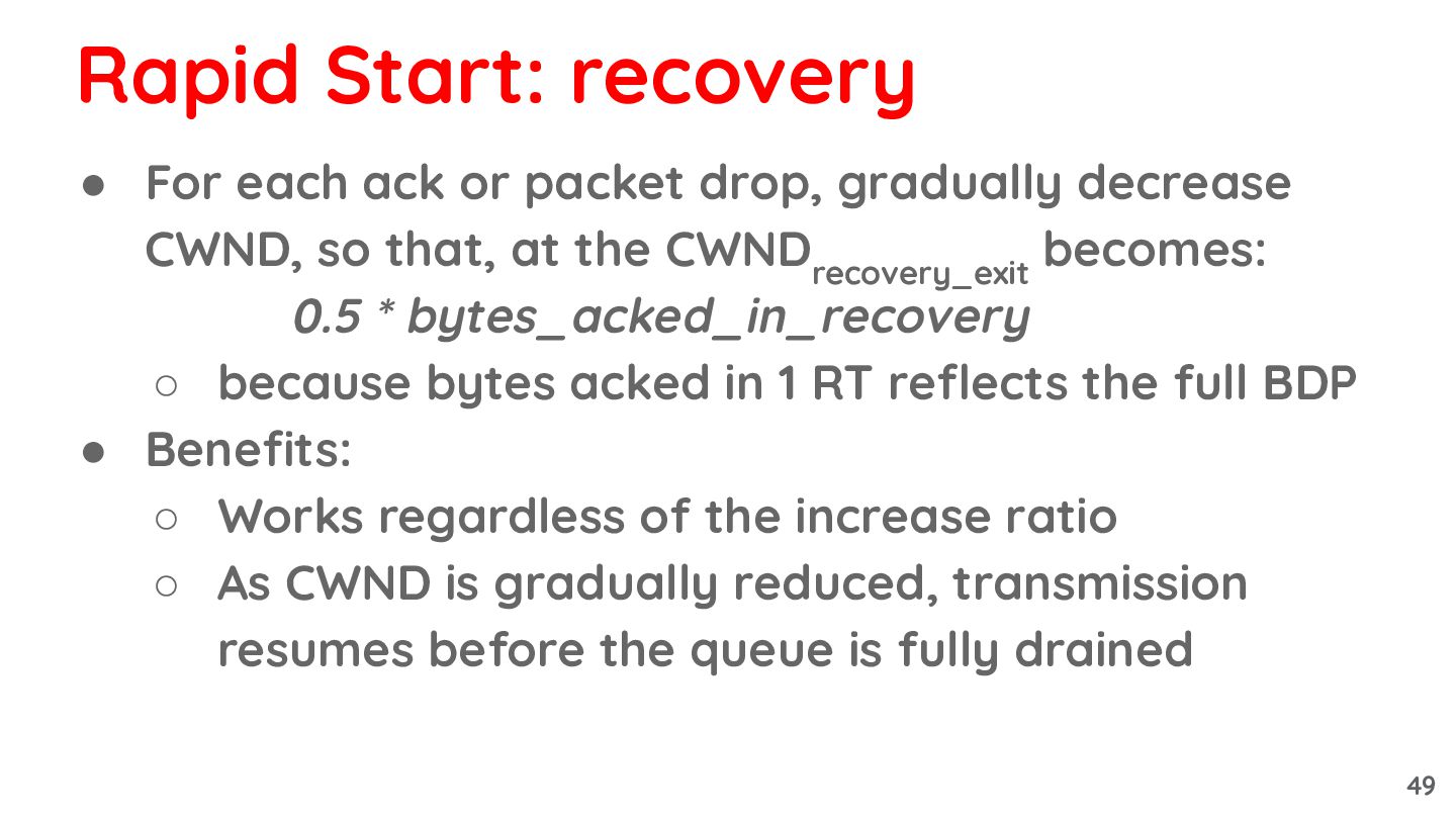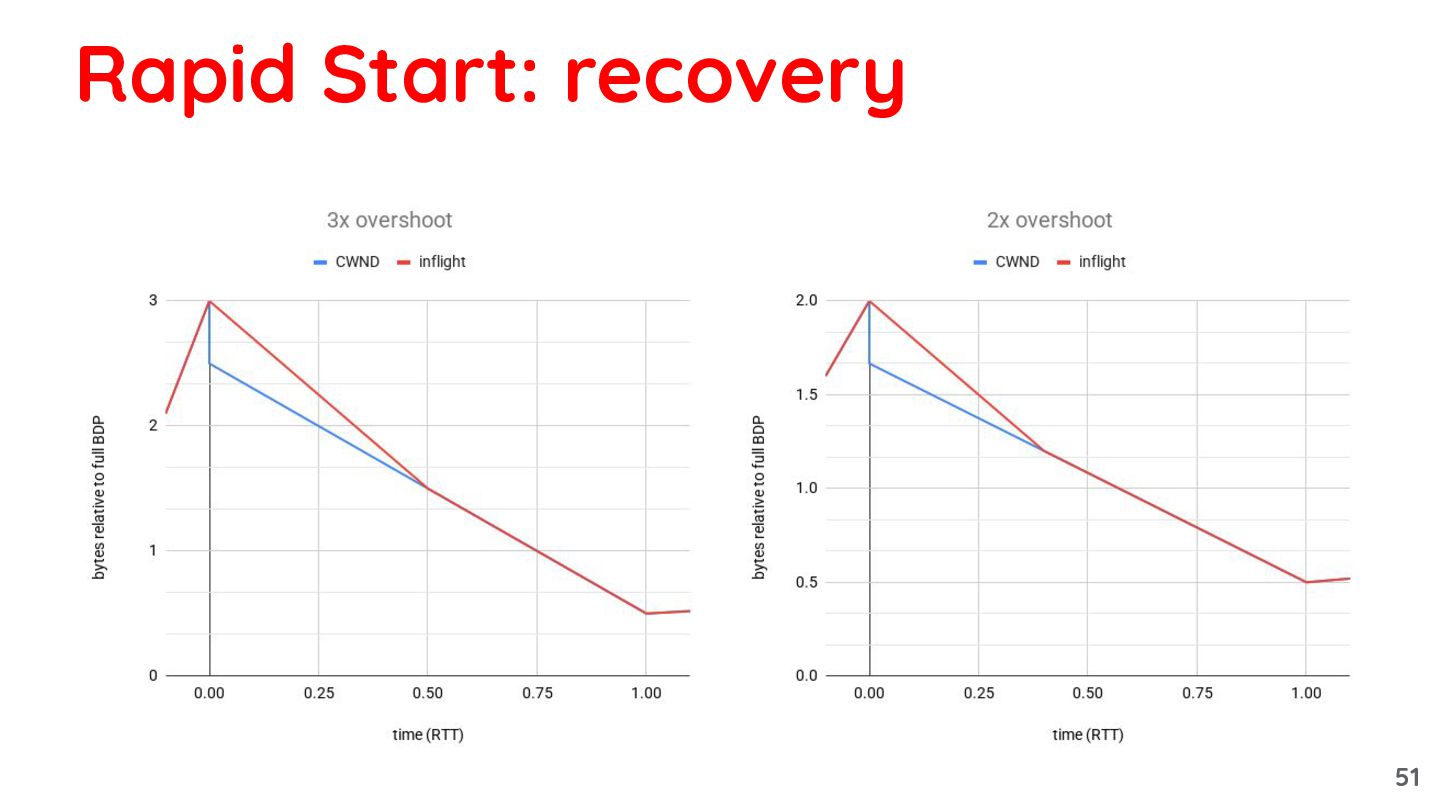 so that, at the CWND recovery_exit becomes: 0.5 * bytes_acked_in_recovery ◦ because bytes acked in 1 RT reflects the full BDP • Benefits: ◦ Works regardless of the increase ratio ◦ As CWND is gradually reduced, transmission resumes before the queue is fully drained Rapid Start: recovery 49
