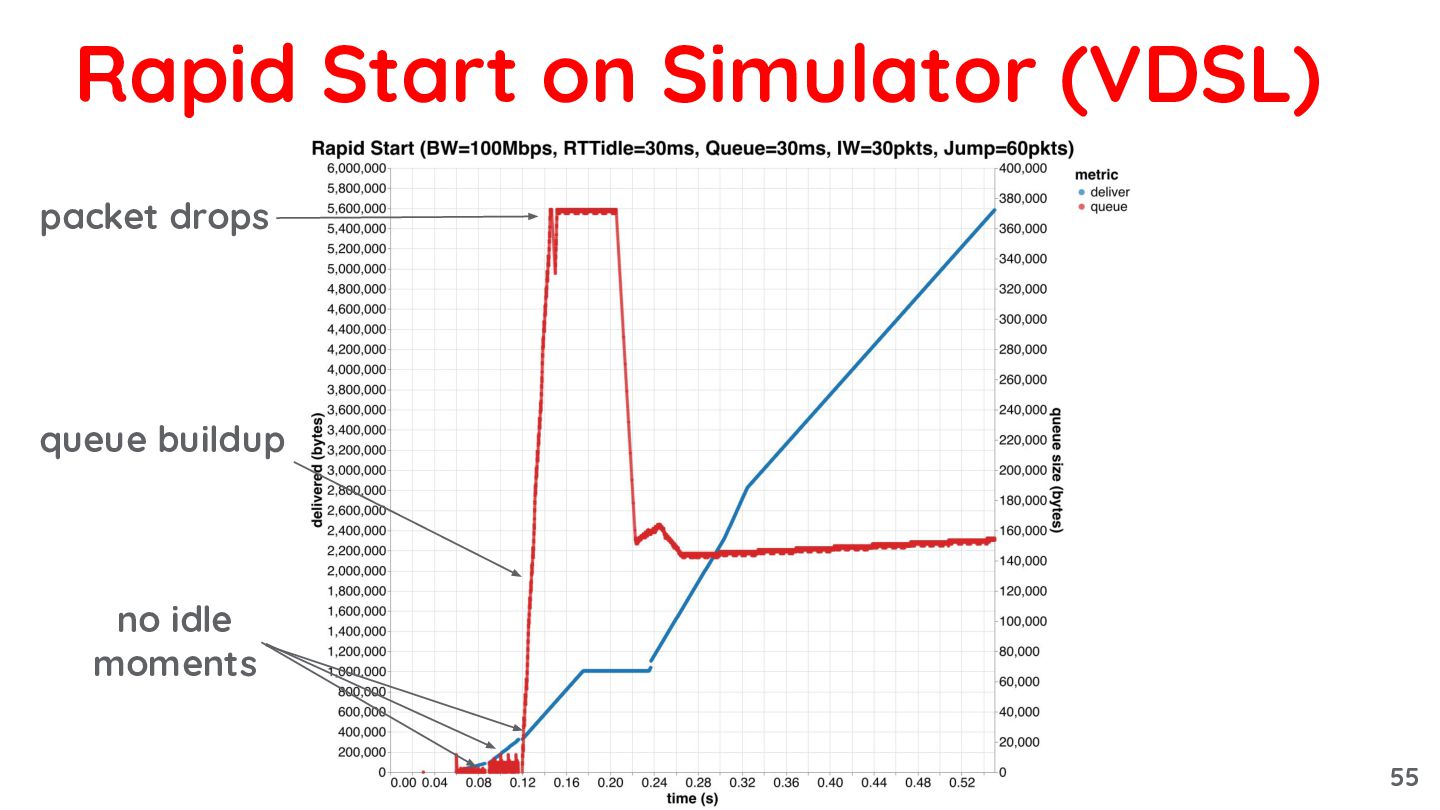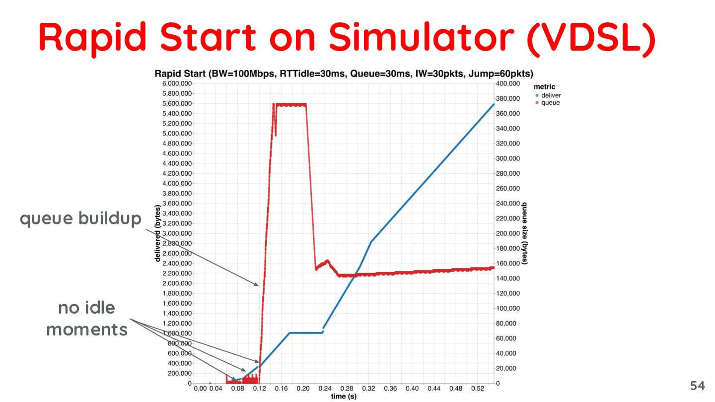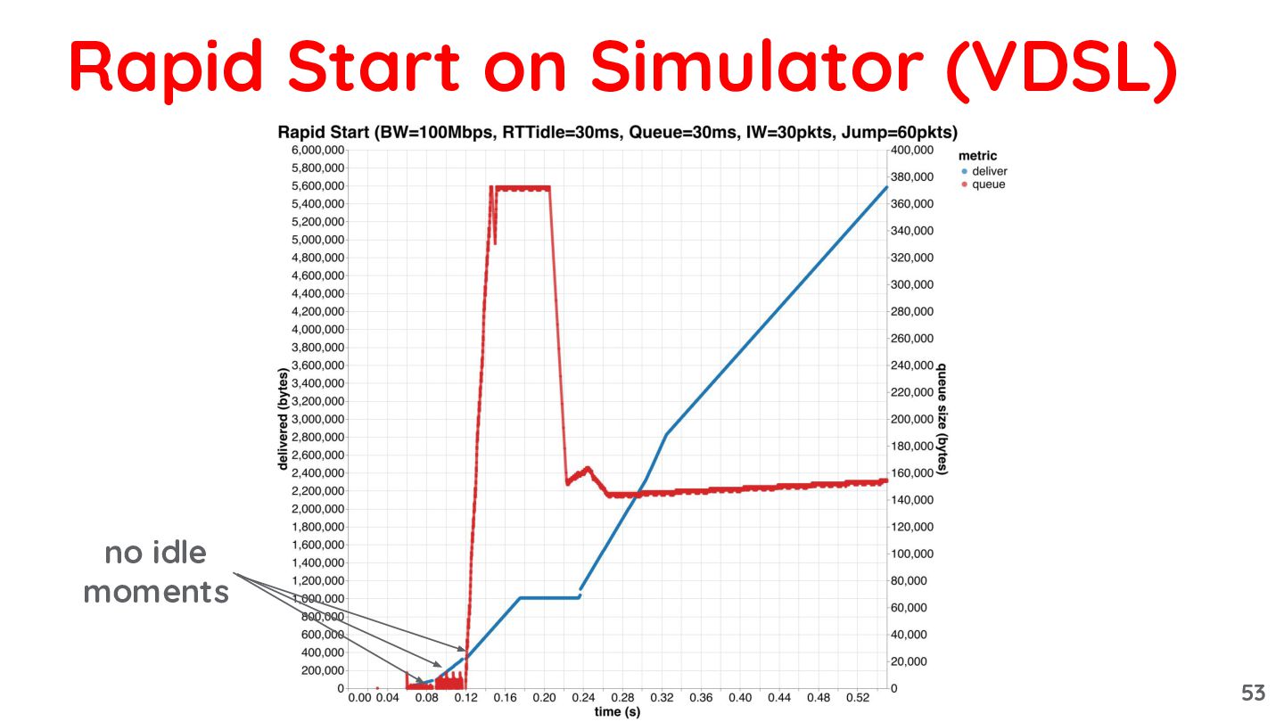 so that, at the CWND recovery_exit becomes: 0.5 * bytes_acked_in_recovery ◦ because bytes acked in 1 RT reflects the full BDP • Benefits: ◦ Works regardless of the increase ratio ◦ As CWND is gradually reduced, transmission resumes before the queue is fully drained Rapid Start: recovery 49