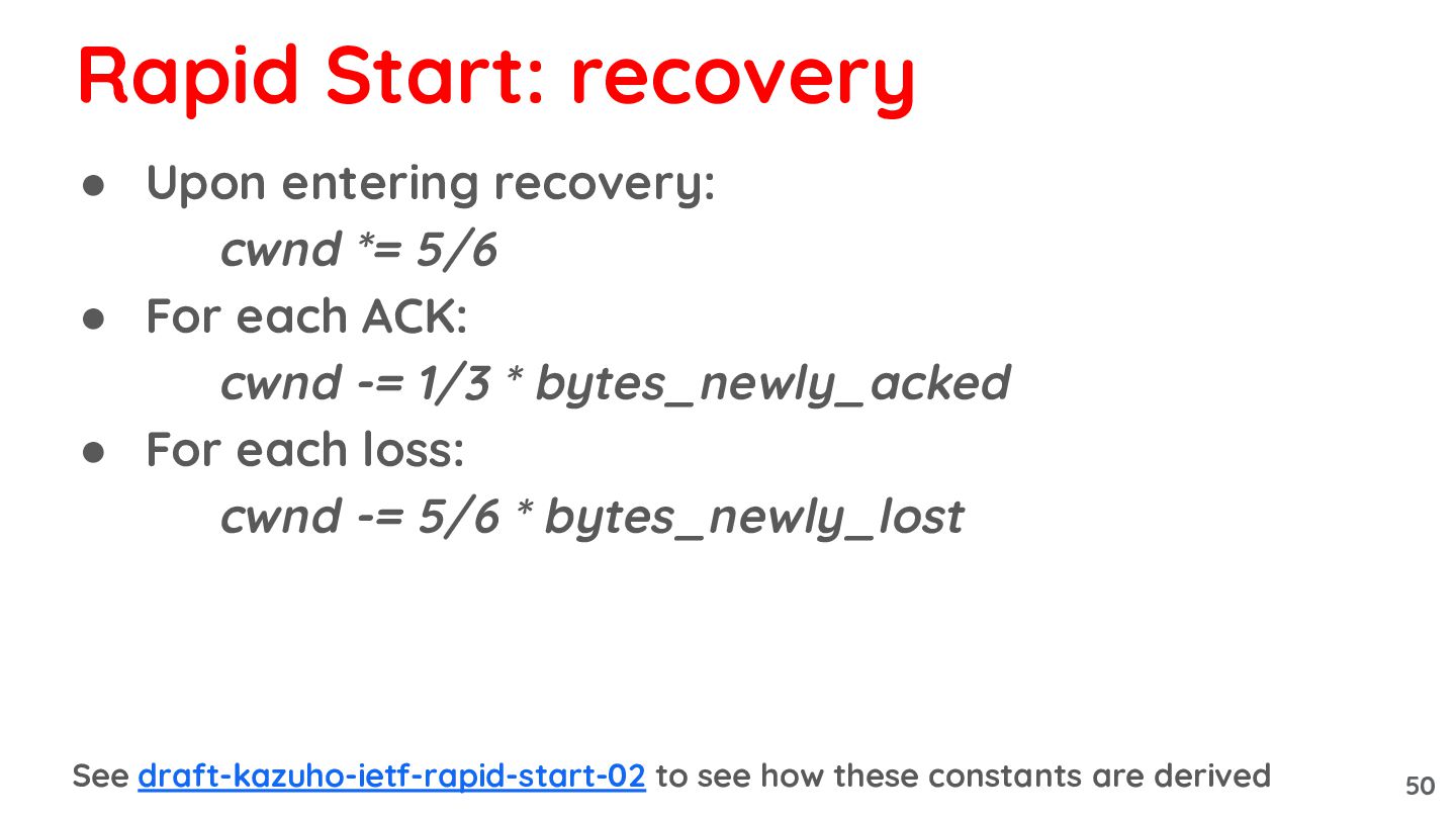 ACK: cwnd -= 1/3 * bytes_newly_acked • For each loss: cwnd -= 5/6 * bytes_newly_lost See draft-kazuho-ietf-rapid-start-02 to see how these constants are derived Rapid Start: recovery 50