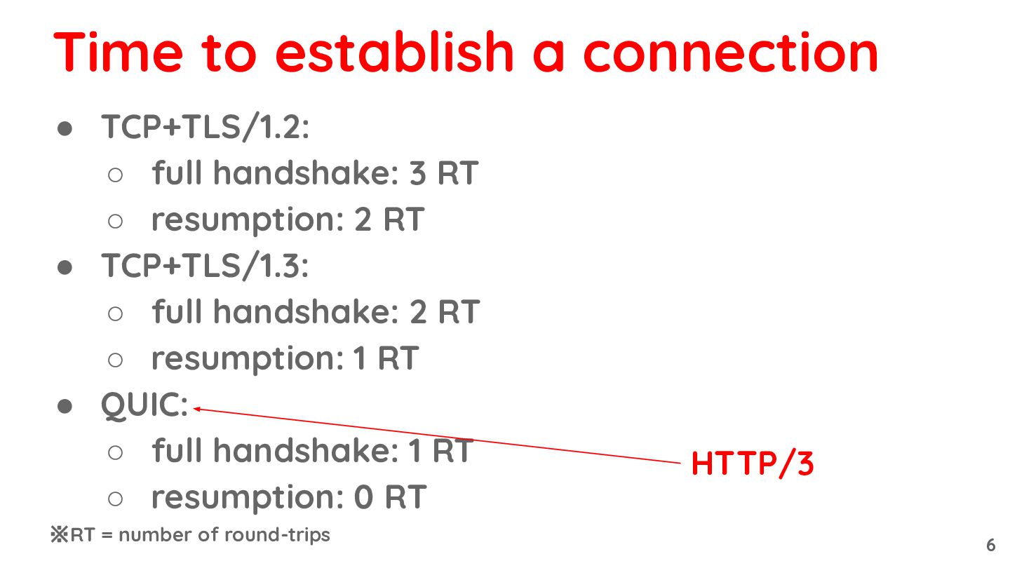 3. • TCP+TLS/1.2: ◦ full handshake: 3 RT ◦ resumption: 2