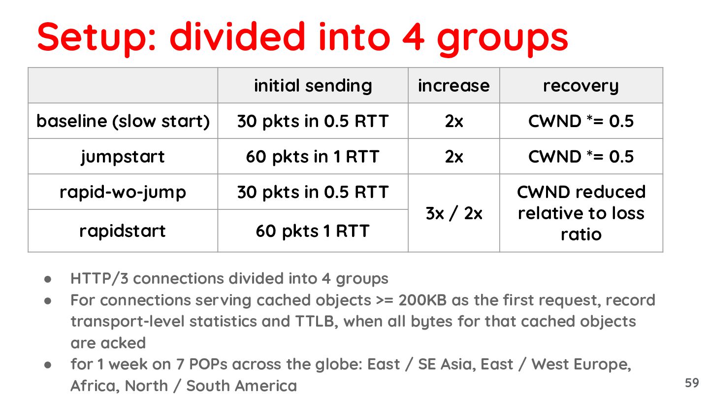 serving cached objects >= 200KB as the first request, record transport-level statistics and TTLB, when all bytes for that cached objects are acked • for 1 week on 7 POPs across the globe: East / SE Asia, East / West Europe, Africa, North / South America Setup: divided into 4 groups initial sending increase recovery baseline (slow start) 30 pkts in 0.5 RTT 2x CWND *= 0.5 jumpstart 60 pkts in 1 RTT 2x CWND *= 0.5 rapid-wo-jump 30 pkts in 0.5 RTT 3x / 2x CWND reduced relative to loss ratio rapidstart 60 pkts 1 RTT 59