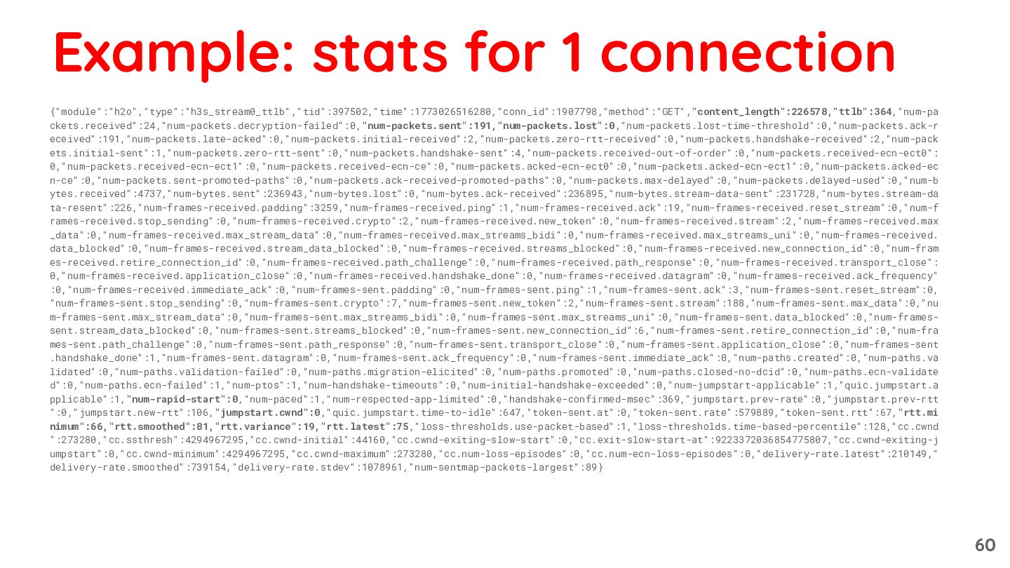 data_blocked":0,"num-frames-received.stream_data_blocked":0,"num-frames-received.streams_blocked":0,"num-frames-received.new_connection_id":0,"num-fram es-received.retire_connection_id":0,"num-frames-received.path_challenge":0,"num-frames-received.path_response":0,"num-frames-received.transport_close": 0,"num-frames-received.application_close":0,"num-frames-received.handshake_done":0,"num-frames-received.datagram":0,"num-frames-received.ack_frequency" :0,"num-frames-received.immediate_ack":0,"num-frames-sent.padding":0,"num-frames-sent.ping":1,"num-frames-sent.ack":3,"num-frames-sent.reset_stream":0, "num-frames-sent.stop_sending":0,"num-frames-sent.crypto":7,"num-frames-sent.new_token":2,"num-frames-sent.stream":188,"num-frames-sent.max_data":0,"nu m-frames-sent.max_stream_data":0,"num-frames-sent.max_streams_bidi":0,"num-frames-sent.max_streams_uni":0,"num-frames-sent.data_blocked":0,"num-frames- sent.stream_data_blocked":0,"num-frames-sent.streams_blocked":0,"num-frames-sent.new_connection_id":6,"num-frames-sent.retire_connection_id":0,"num-fra mes-sent.path_challenge":0,"num-frames-sent.path_response":0,"num-frames-sent.transport_close":0,"num-frames-sent.application_close":0,"num-frames-sent .handshake_done":1,"num-frames-sent.datagram":0,"num-frames-sent.ack_frequency":0,"num-frames-sent.immediate_ack":0,"num-paths.created":0,"num-paths.va lidated":0,"num-paths.validation-failed":0,"num-paths.migration-elicited":0,"num-paths.promoted":0,"num-paths.closed-no-dcid":0,"num-paths.ecn-validate d":0,"num-paths.ecn-failed":1,"num-ptos":1,"num-handshake-timeouts":0,"num-initial-handshake-exceeded":0,"num-jumpstart-applicable":1,"quic.jumpstart.a pplicable":1,"num-rapid-start":0,"num-paced":1,"num-respected-app-limited":0,"handshake-confirmed-msec":369,"jumpstart.prev-rate":0,"jumpstart.prev-rtt ":0,"jumpstart.new-rtt":106,"jumpstart.cwnd":0,"quic.jumpstart.time-to-idle":647,"token-sent.at":0,"token-sent.rate":579889,"token-sent.rtt":67,"rtt.mi nimum":66,"rtt.smoothed":81,"rtt.variance":19,"rtt.latest":75,"loss-thresholds.use-packet-based":1,"loss-thresholds.time-based-percentile":128,"cc.cwnd ":273280,"cc.ssthresh":4294967295,"cc.cwnd-initial":44160,"cc.cwnd-exiting-slow-start":0,"cc.exit-slow-start-at":9223372036854775807,"cc.cwnd-exiting-j umpstart":0,"cc.cwnd-minimum":4294967295,"cc.cwnd-maximum":273280,"cc.num-loss-episodes":0,"cc.num-ecn-loss-episodes":0,"delivery-rate.latest":210149," delivery-rate.smoothed":739154,"delivery-rate.stdev":1078961,"num-sentmap-packets-largest":89} Example: stats for 1 connection 60