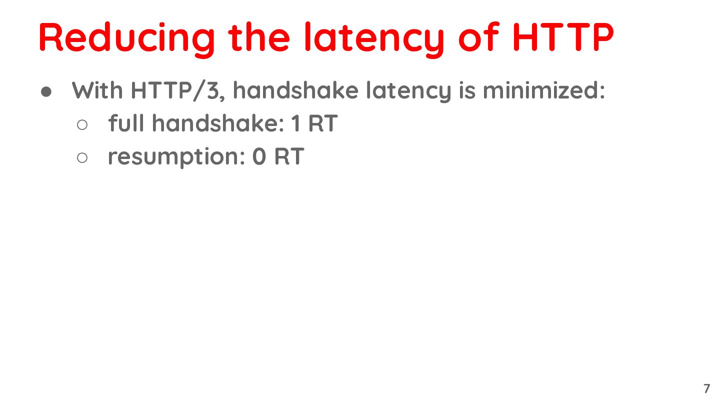 7. • With HTTP/3, handshake latency is minimized: ◦ full handshake: