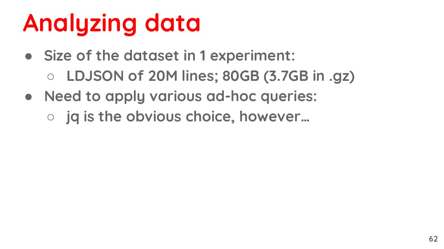 of 20M lines; 80GB (3.7GB in .gz) • Need to apply various ad-hoc queries: ◦ jq is the obvious choice, however… Analyzing data 62