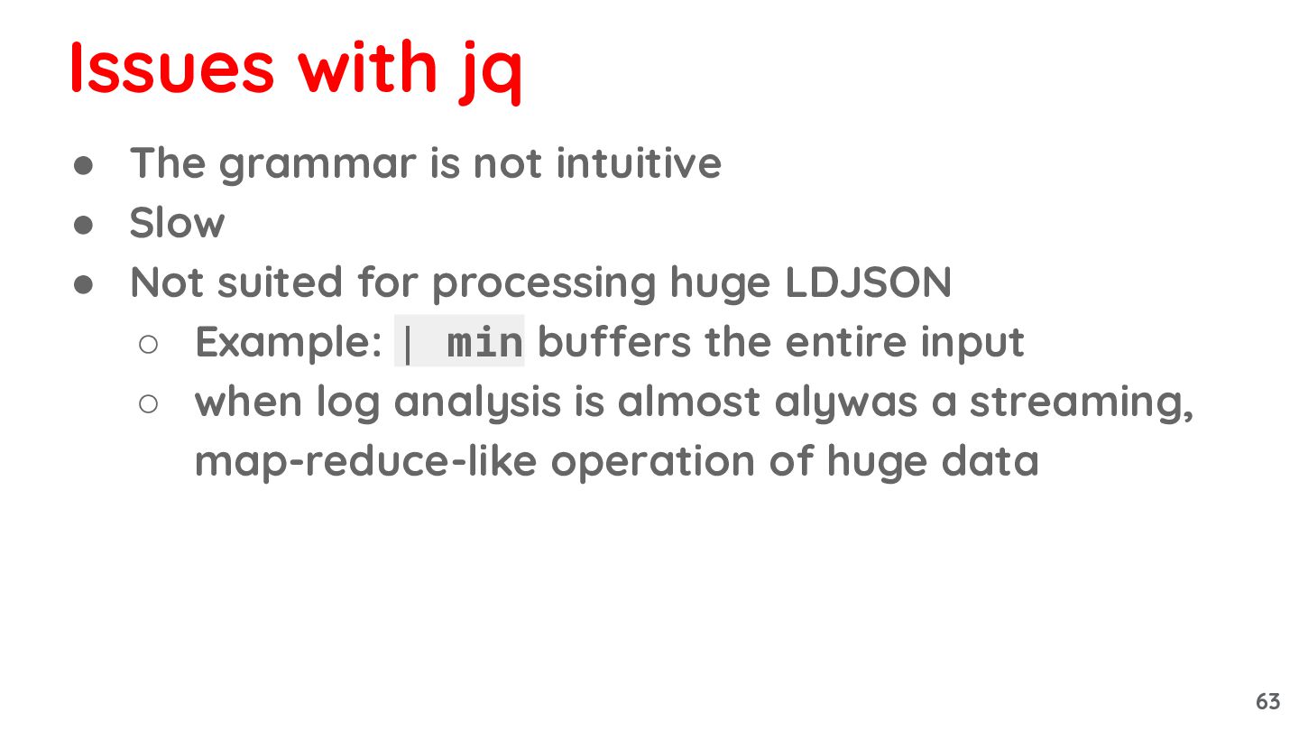 suited for processing huge LDJSON ◦ Example: | min buffers the entire input ◦ when log analysis is almost alywas a streaming, map-reduce-like operation of huge data Issues with jq 63