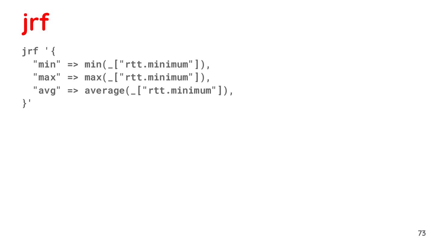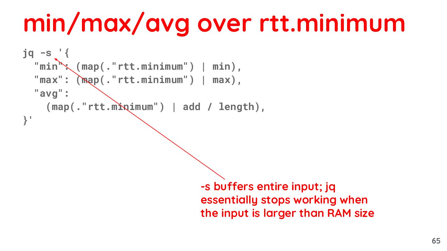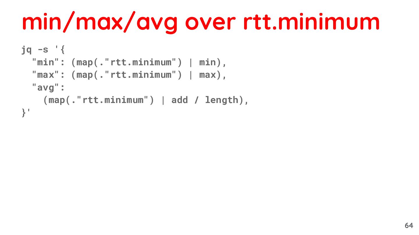 64. • min: ◦ jq -s 'map(."rtt.minimum") | min' ◦ jq
