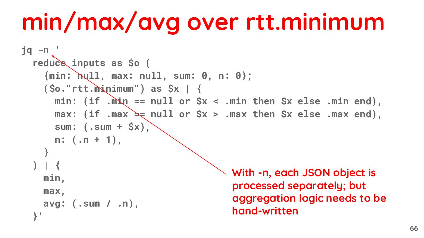 max), "avg": (map(."rtt.minimum") | add / length), }' min/max/avg over rtt.minimum -s buffers entire input; jq essentially stops working when the input is larger than RAM size 65