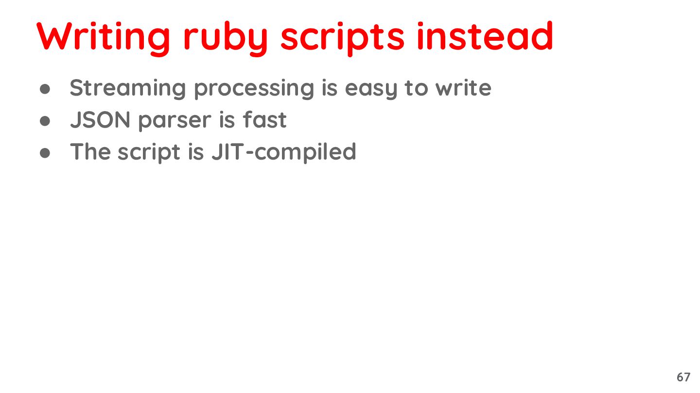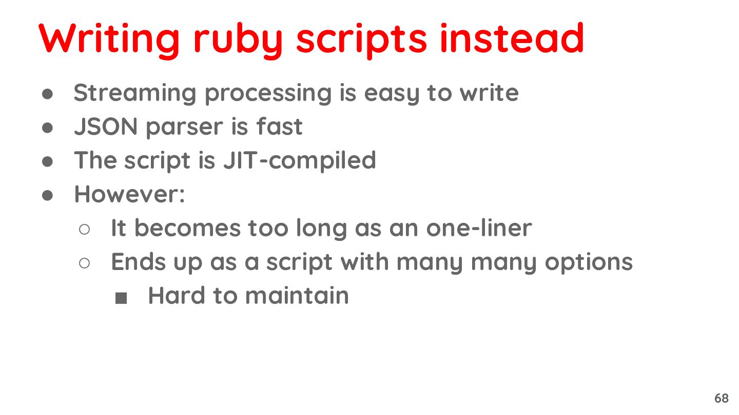 is fast • The script is JIT-compiled • However: ◦ It becomes too long as an one-liner ◦ Ends up as a script with many many options ▪ Hard to maintain Writing ruby scripts instead 68