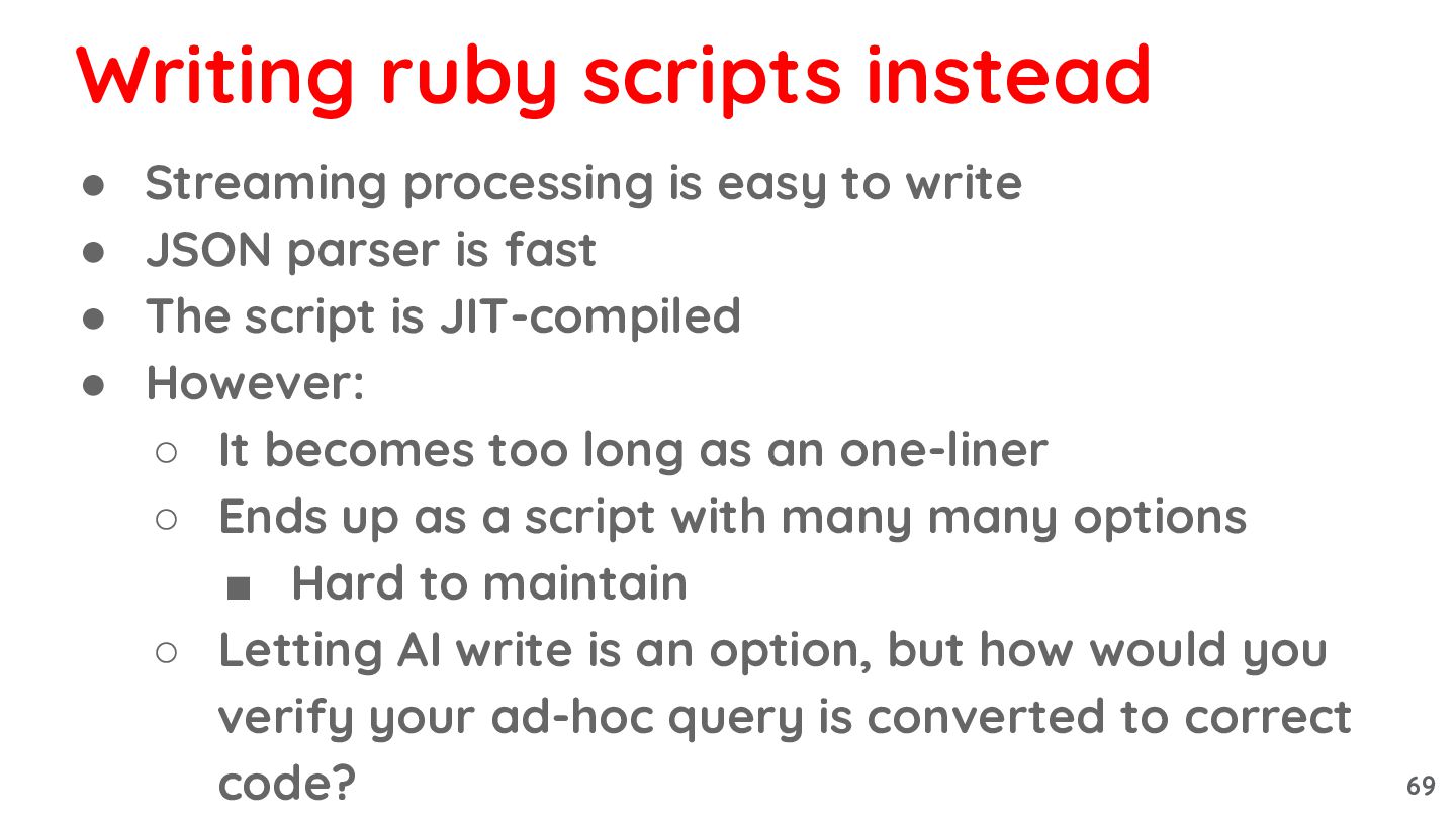 is fast • The script is JIT-compiled • However: ◦ It becomes too long as an one-liner ◦ Ends up as a script with many many options ▪ Hard to maintain ◦ Letting AI write is an option, but how would you verify your ad-hoc query is converted to correct code? Writing ruby scripts instead 69