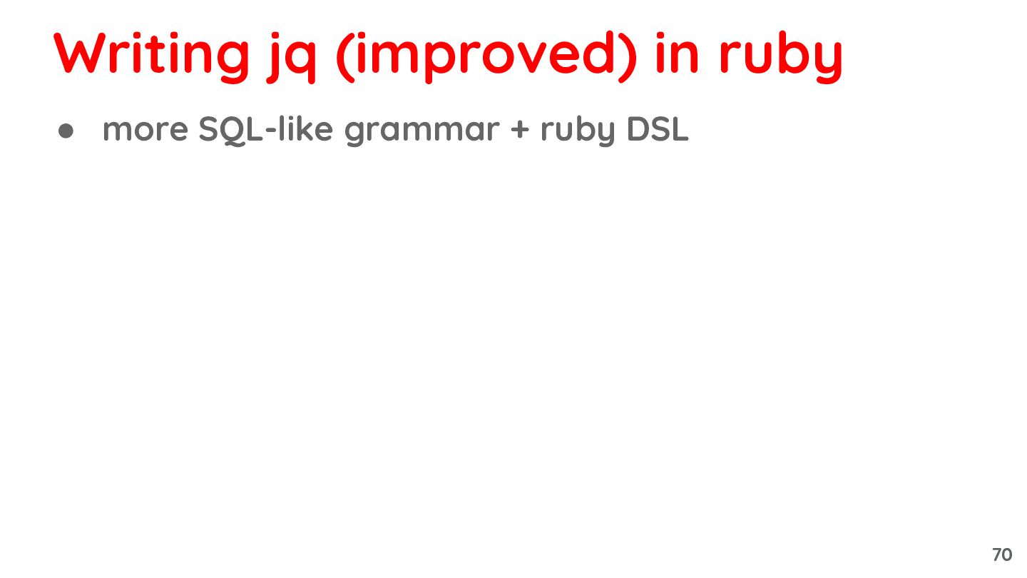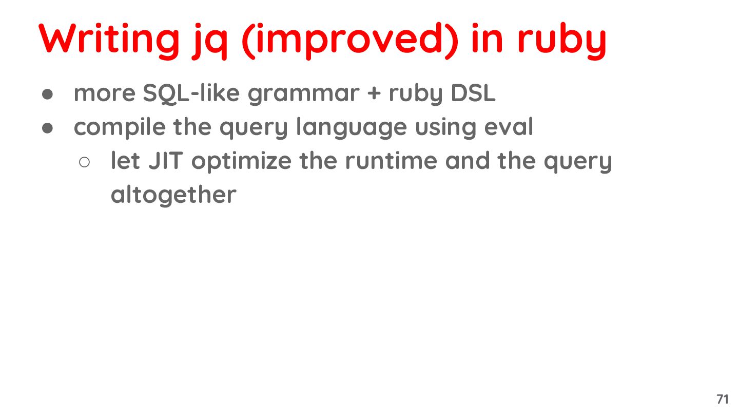 query language using eval ◦ let JIT optimize the runtime and the query altogether Writing jq (improved) in ruby 71