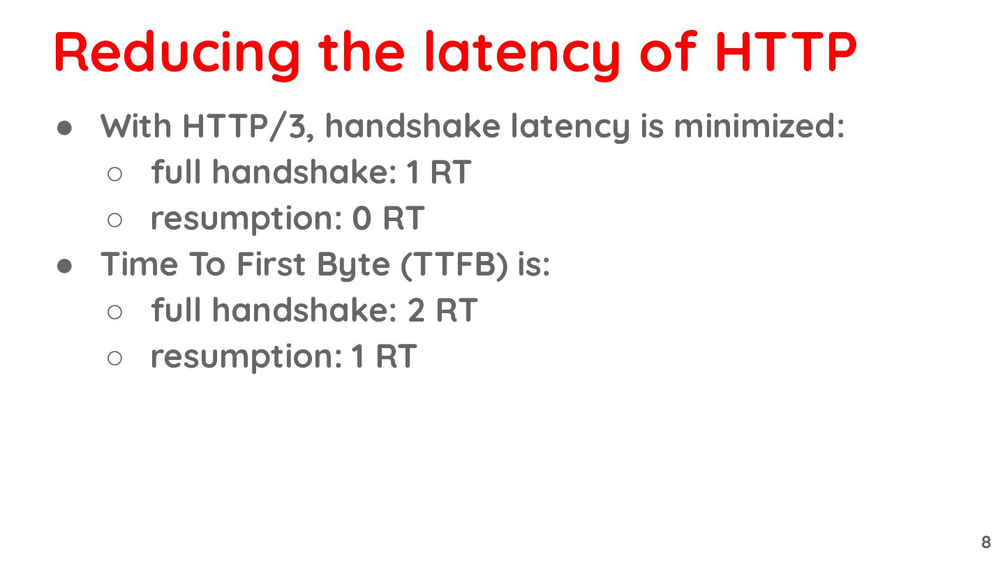 1 RT ◦ resumption: 0 RT Reducing the latency of HTTP 7