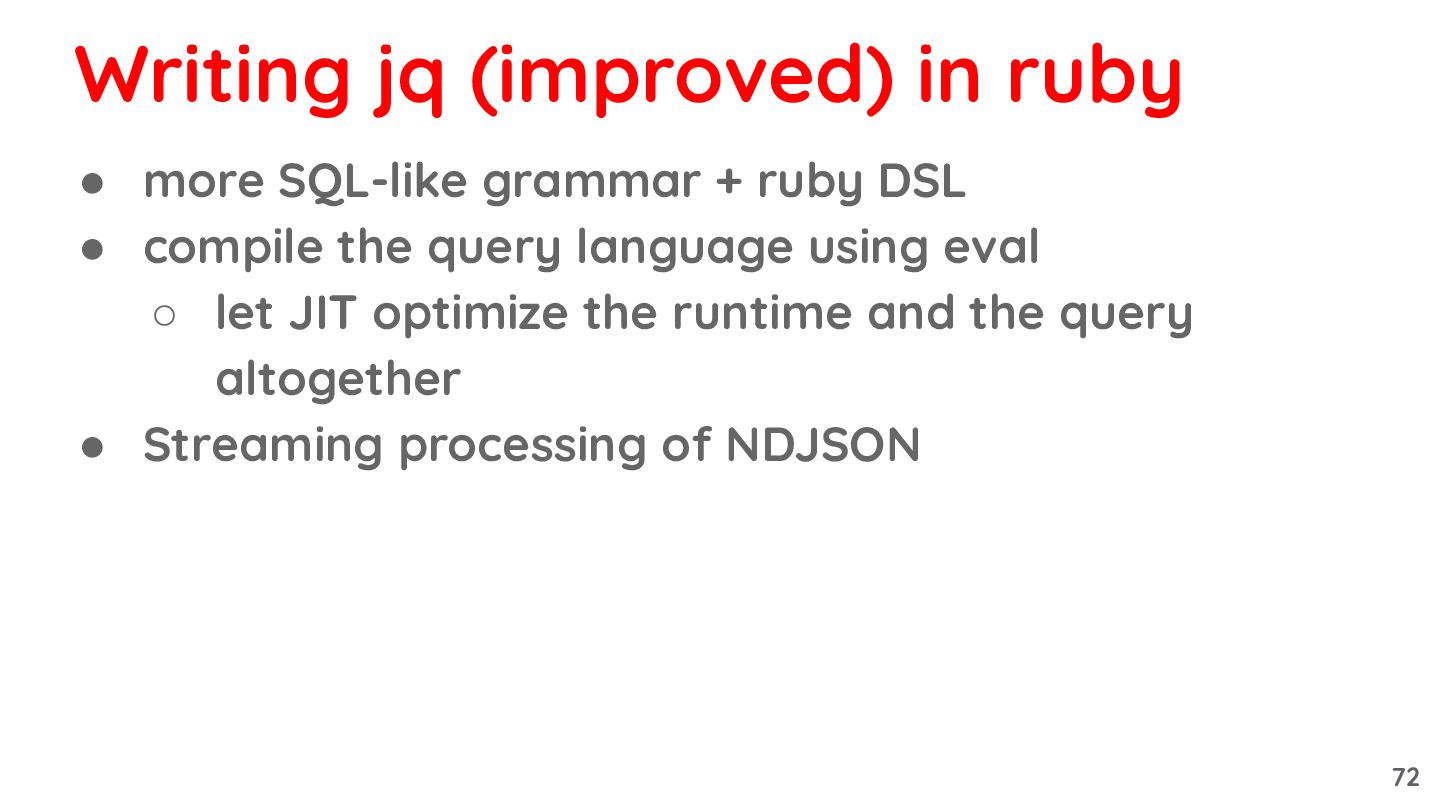 query language using eval ◦ let JIT optimize the runtime and the query altogether • Streaming processing of NDJSON Writing jq (improved) in ruby 72