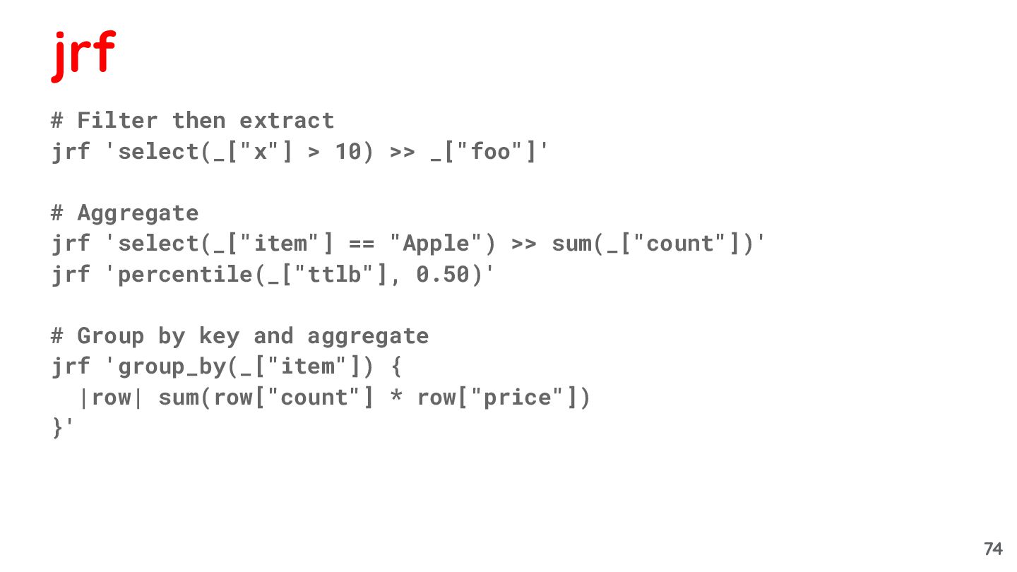 # Aggregate jrf 'select(_["item"] == "Apple") >> sum(_["count"])' jrf 'percentile(_["ttlb"], 0.50)' # Group by key and aggregate jrf 'group_by(_["item"]) { |row| sum(row["count"] * row["price"]) }' jrf 74