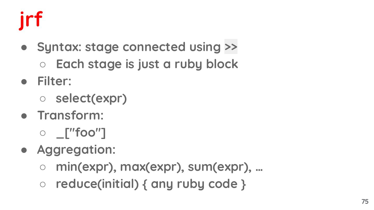 just a ruby block • Filter: ◦ select(expr) • Transform: ◦ _["foo"] • Aggregation: ◦ min(expr), max(expr), sum(expr), … ◦ reduce(initial) { any ruby code } jrf 75
