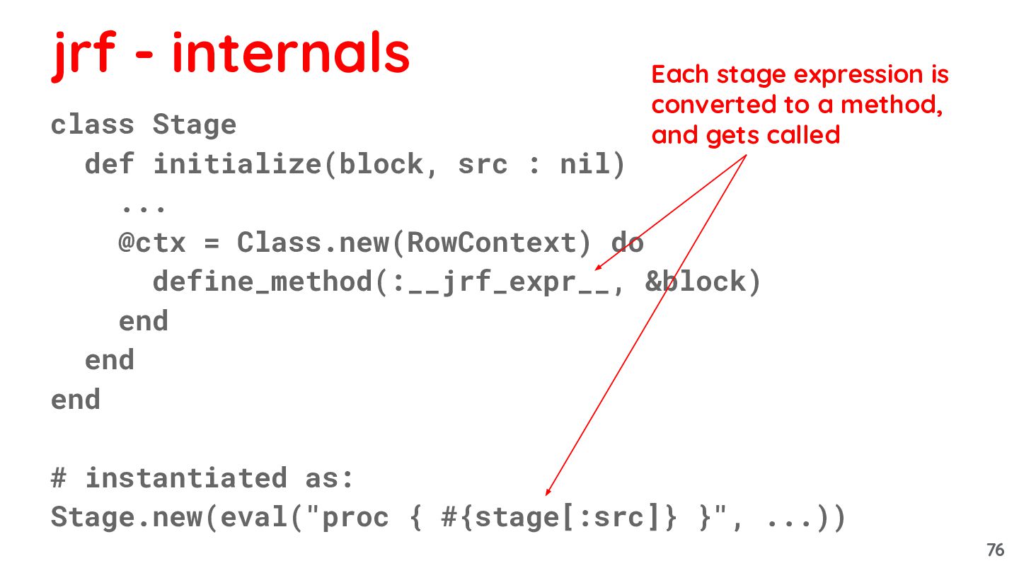 Class.new(RowContext) do define_method(:__jrf_expr__, &block) end end end # instantiated as: Stage.new(eval("proc { #{stage[:src]} }", ...)) jrf - internals Each stage expression is converted to a method, and gets called 76