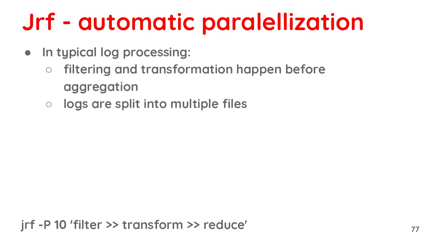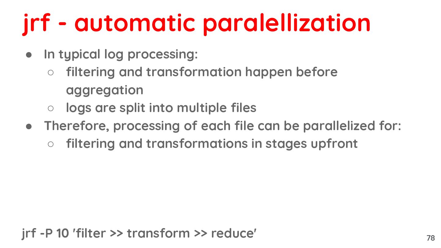before aggregation ◦ logs are split into multiple files jrf -P 10 'filter >> transform >> reduce' Jrf - automatic paralellization 77