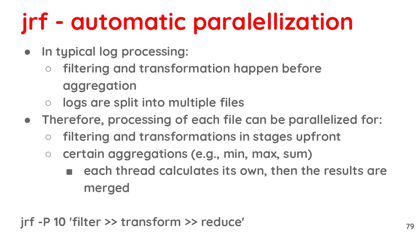 before aggregation ◦ logs are split into multiple files • Therefore, processing of each file can be parallelized for: ◦ filtering and transformations in stages upfront jrf -P 10 'filter >> transform >> reduce' jrf - automatic paralellization 78