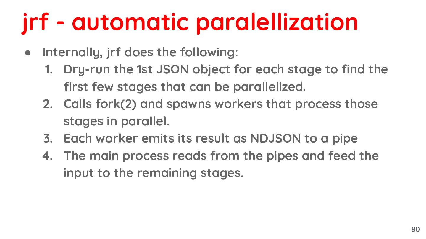 JSON object for each stage to find the first few stages that can be parallelized. 2. Calls fork(2) and spawns workers that process those stages in parallel. 3. Each worker emits its result as NDJSON to a pipe 4. The main process reads from the pipes and feed the input to the remaining stages. jrf - automatic paralellization 80