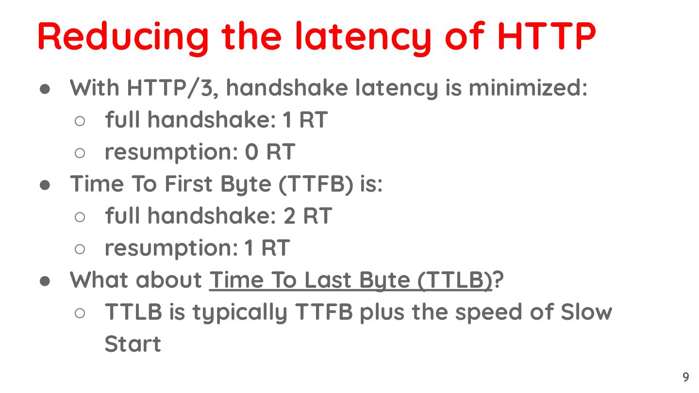 1 RT ◦ resumption: 0 RT • Time To First Byte (TTFB) is: ◦ full handshake: 2 RT ◦ resumption: 1 RT Reducing the latency of HTTP 8