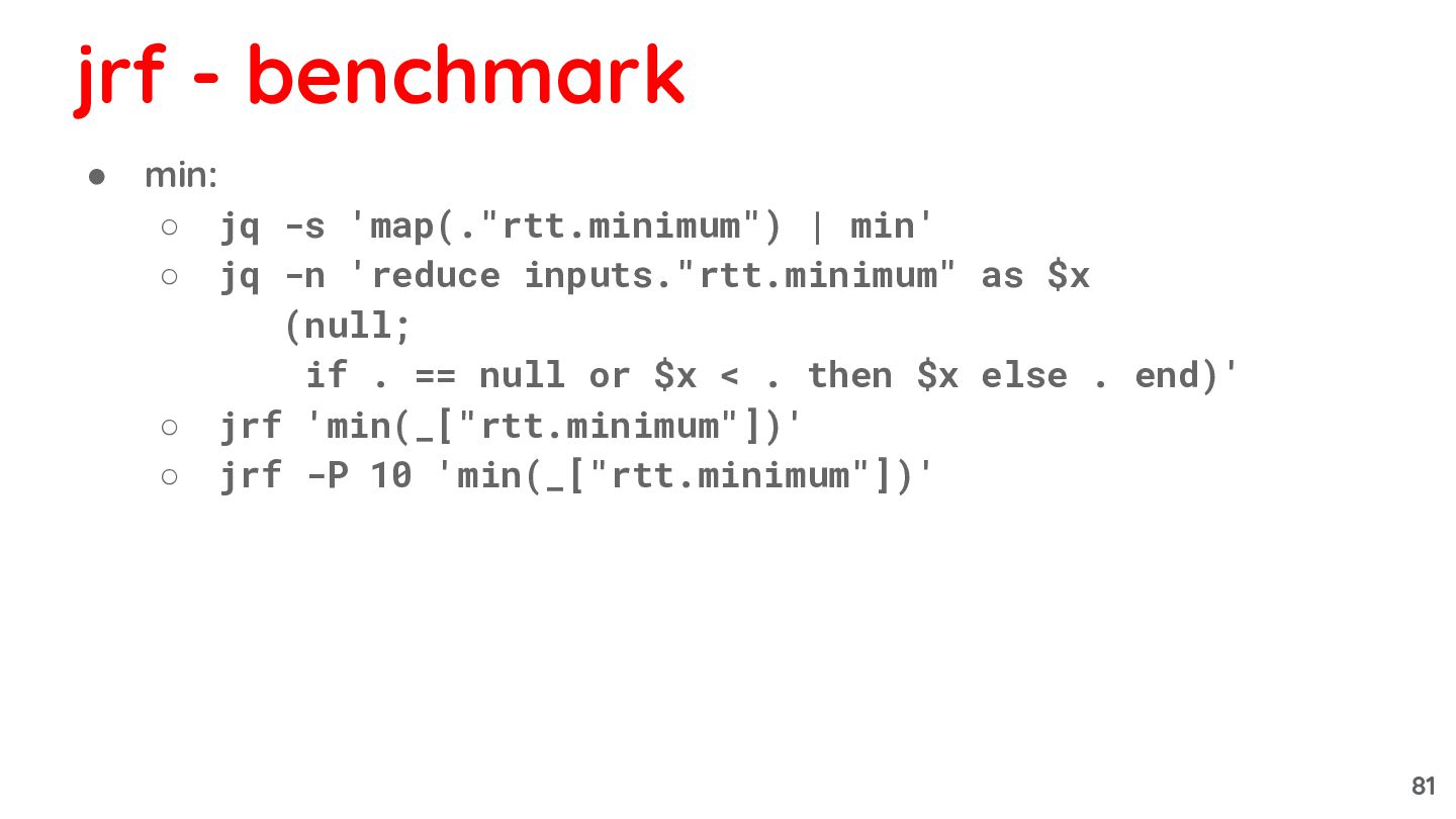 -n 'reduce inputs."rtt.minimum" as $x (null; if . == null or $x < . then $x else . end)' ◦ jrf 'min(_["rtt.minimum"])' ◦ jrf -P 10 'min(_["rtt.minimum"])' jrf - benchmark 81