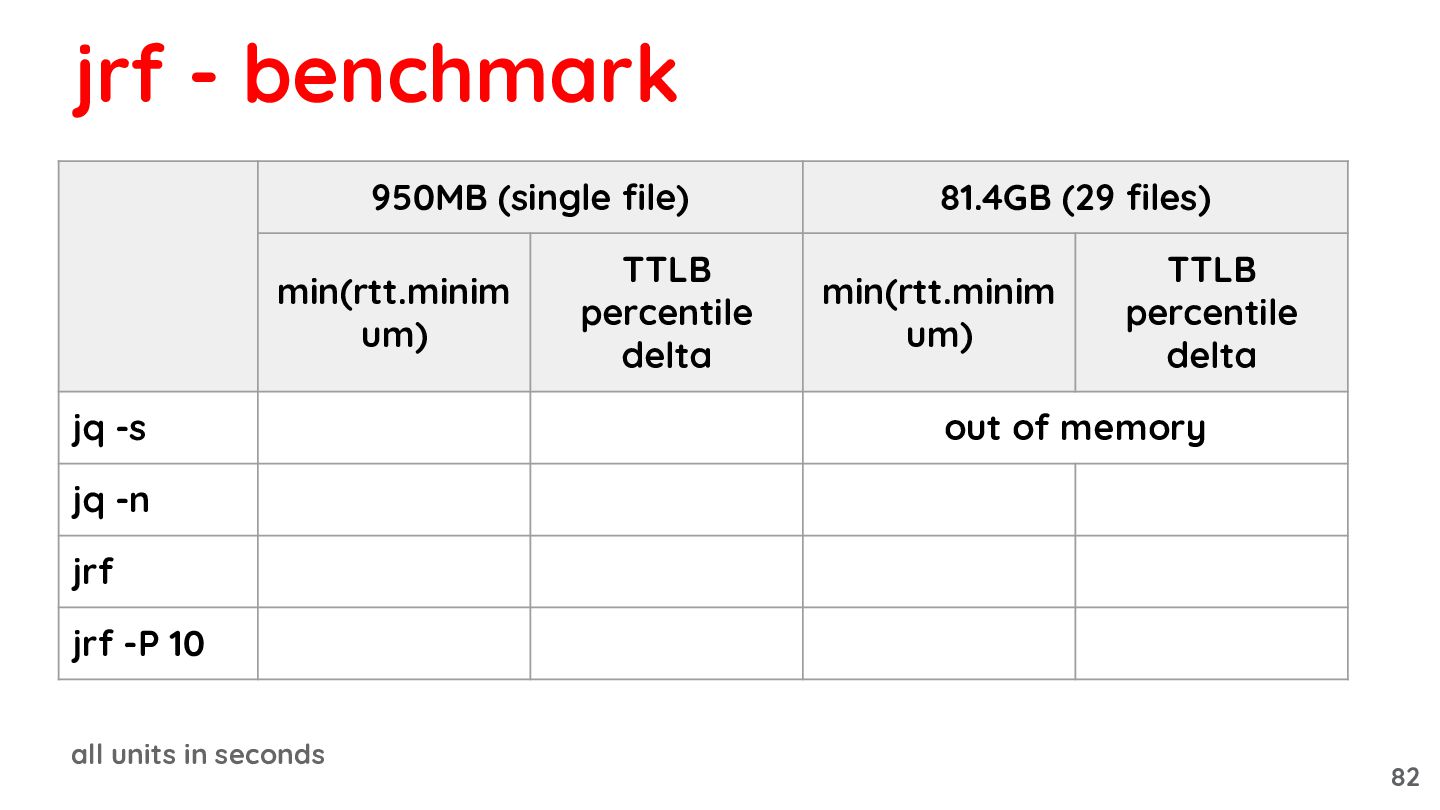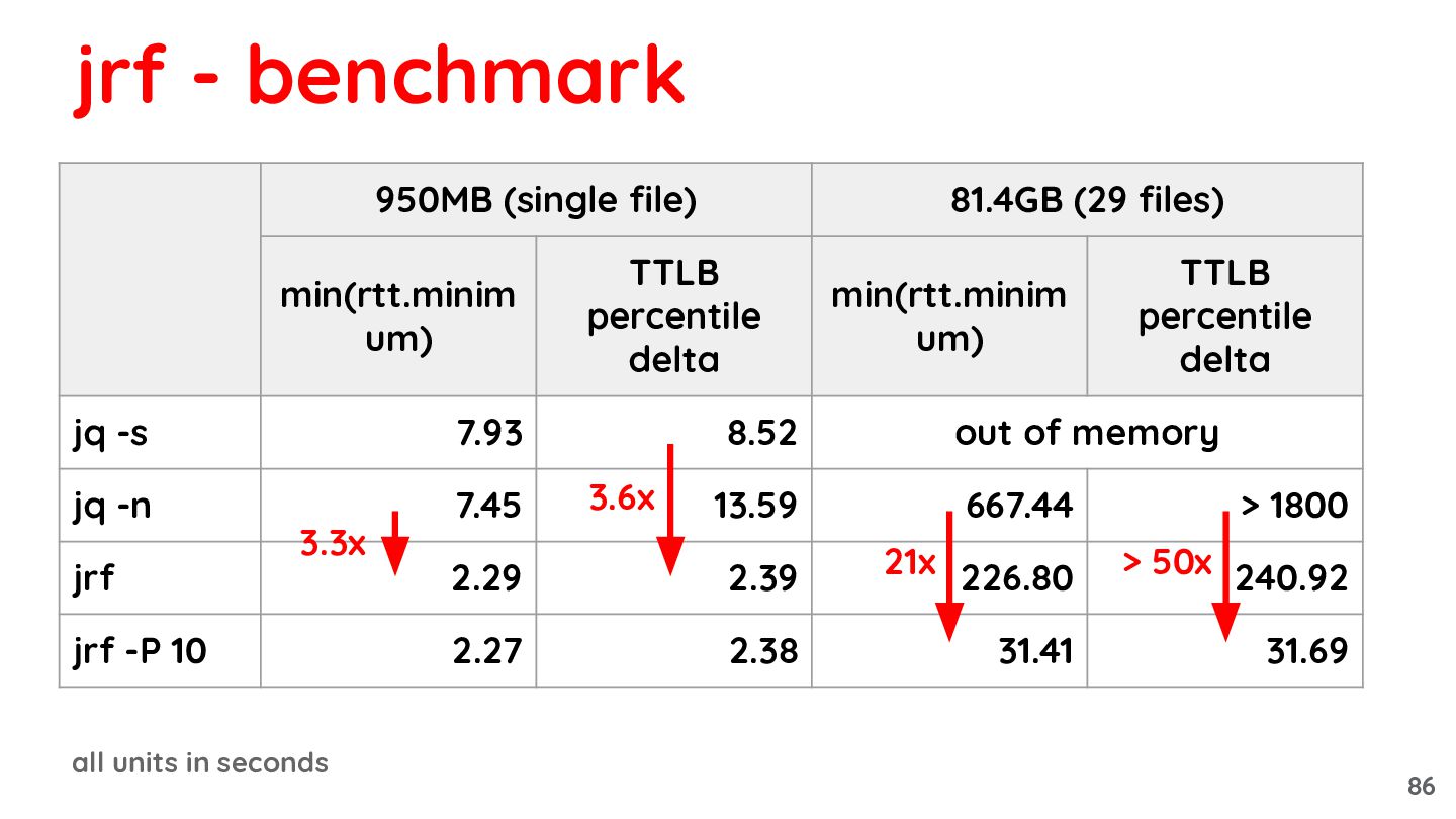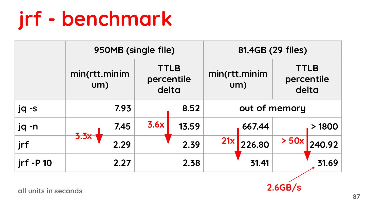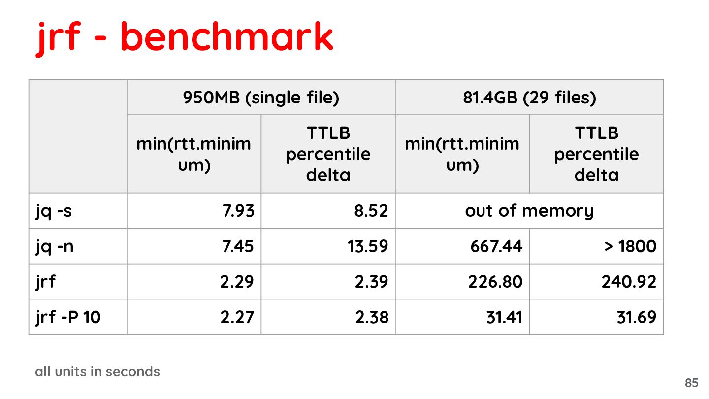 81.4GB (29 files) min(rtt.minim um) TTLB percentile delta min(rtt.minim um) TTLB percentile delta jq -s 7.93 8.52 out of memory jq -n 7.45 13.59 667.44 > 1800 jrf 2.29 2.39 226.80 240.92 jrf -P 10 2.27 2.38 31.41 31.69 3.3x 3.6x 21x > 50x 2.6GB/s 87