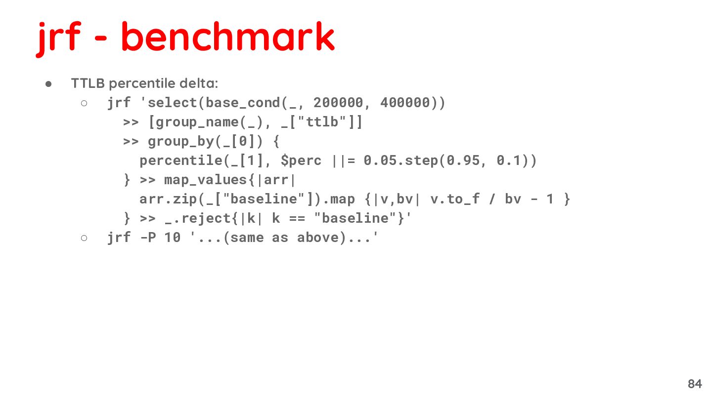 [group_name(_), _["ttlb"]] >> group_by(_[0]) { percentile(_[1], $perc ||= 0.05.step(0.95, 0.1)) } >> map_values{|arr| arr.zip(_["baseline"]).map {|v,bv| v.to_f / bv - 1 } } >> _.reject{|k| k == "baseline"}' ◦ jrf -P 10 '...(same as above)...' jrf - benchmark 84