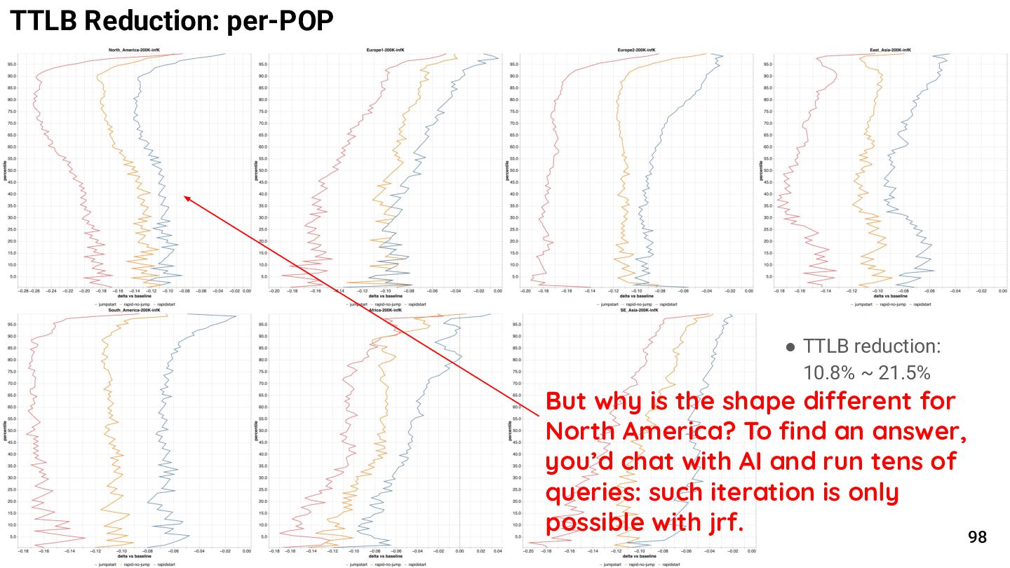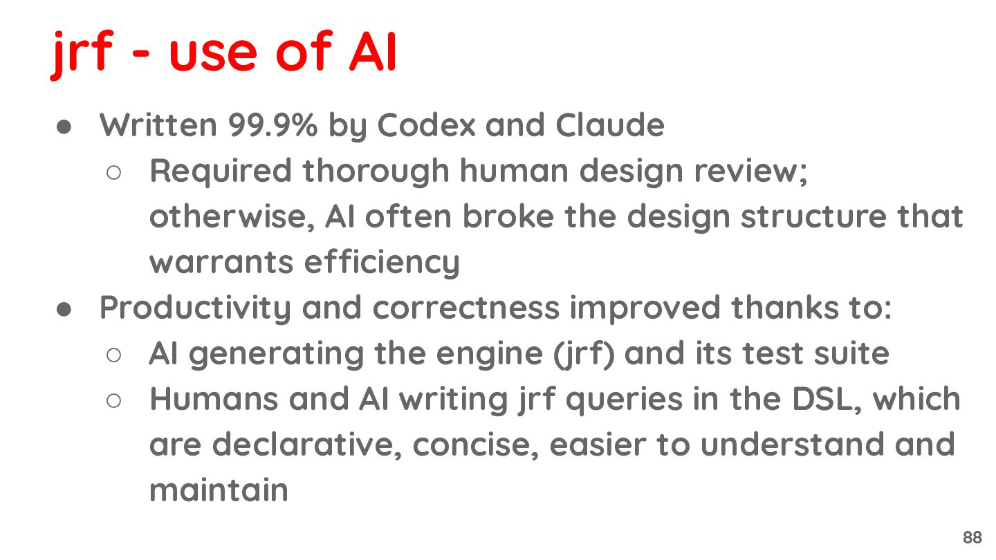 human design review; otherwise, AI often broke the design structure that warrants efficiency • Productivity and correctness improved thanks to: ◦ AI generating the engine (jrf) and its test suite ◦ Humans and AI writing jrf queries in the DSL, which are declarative, concise, easier to understand and maintain jrf - use of AI 88