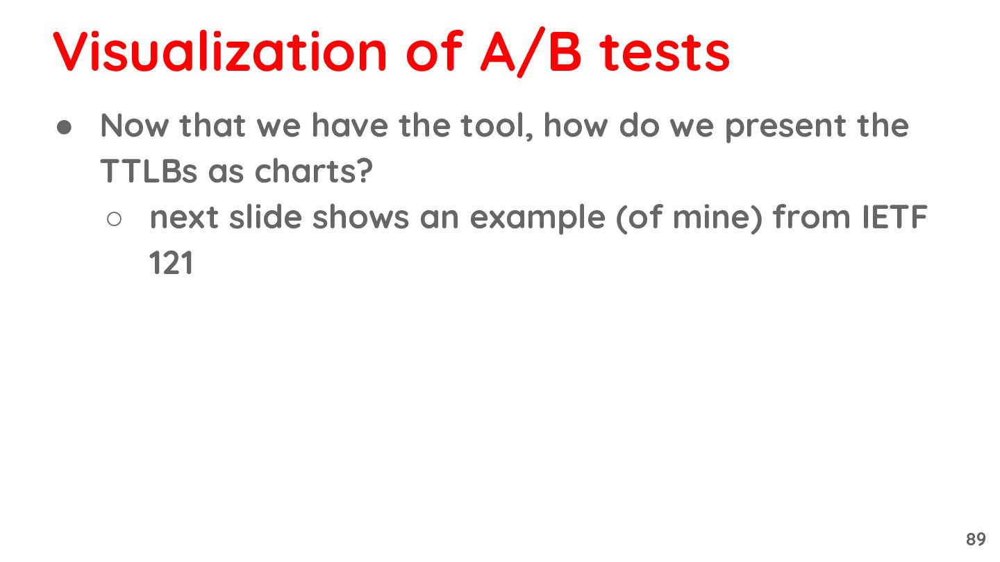 present the TTLBs as charts? ◦ next slide shows an example (of mine) from IETF 121 Visualization of A/B tests 89