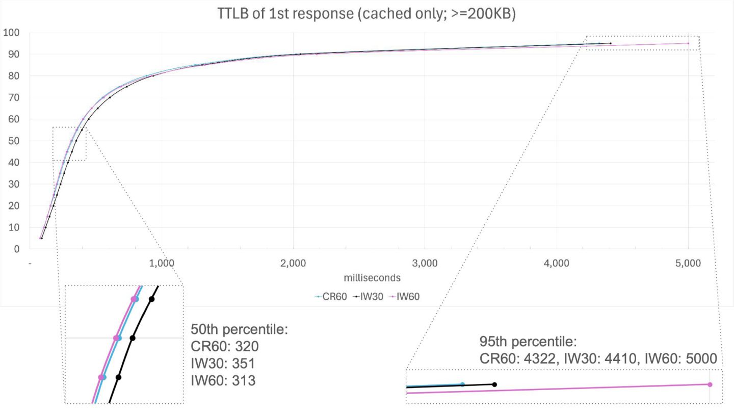 400KB / 400KB - 800KB / 800KB - 1.6MB / 1.6MB - 3.2MB • TTLB reduction: 10.6% (1.6MB - 3.2MB) ~ 14.9% (200KB - 400KB) TTLB Reduction: by Object Size Bin
