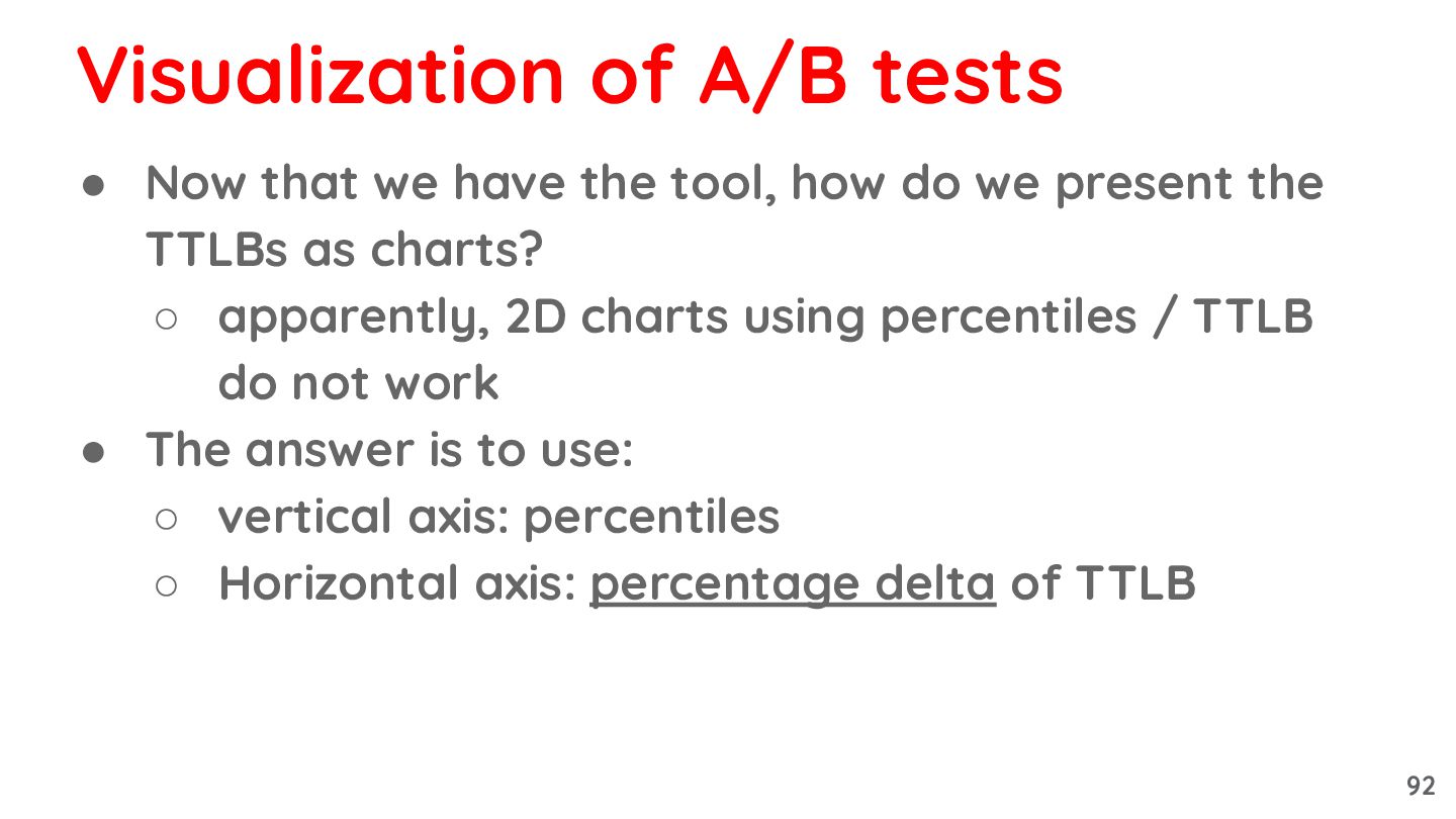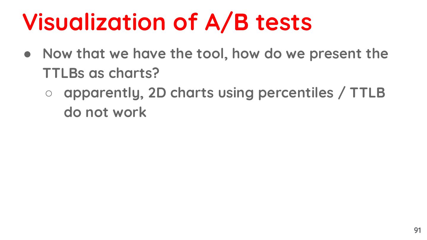 present the TTLBs as charts? ◦ apparently, 2D charts using percentiles / TTLB do not work Visualization of A/B tests 91