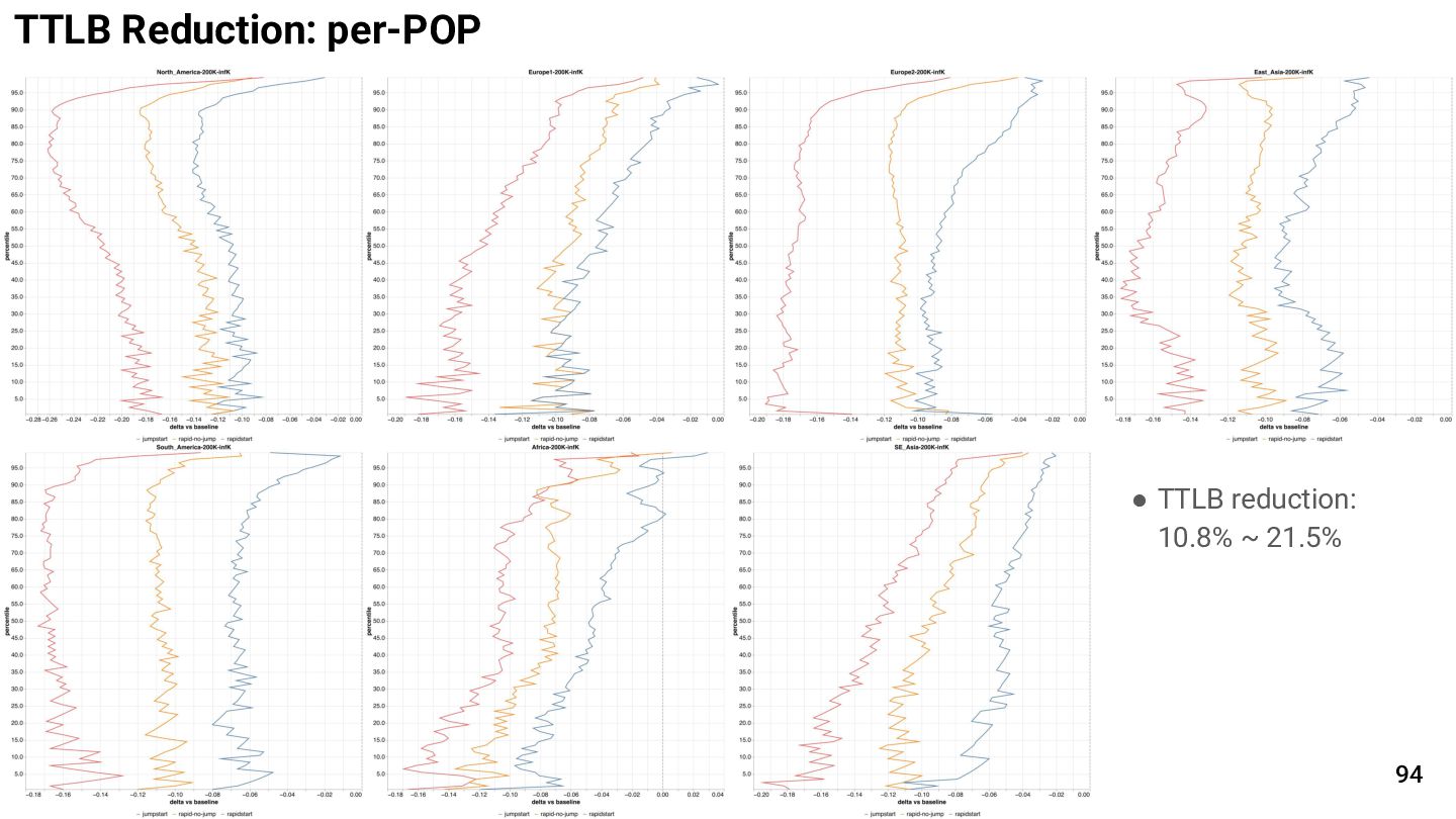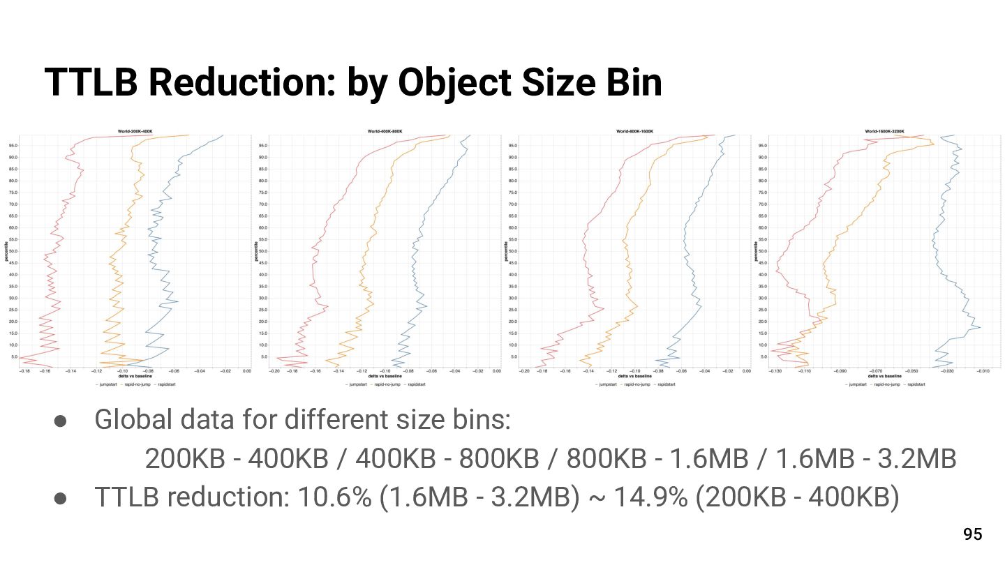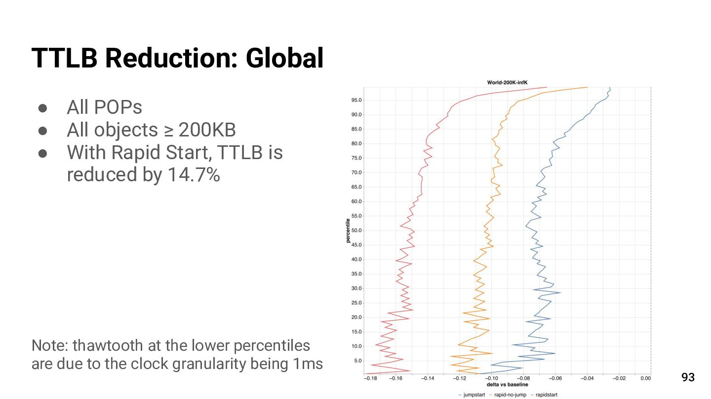Rapid Start, TTLB is reduced by 14.7% Note: thawtooth at the lower percentiles are due to the clock granularity being 1ms TTLB Reduction: Global 93