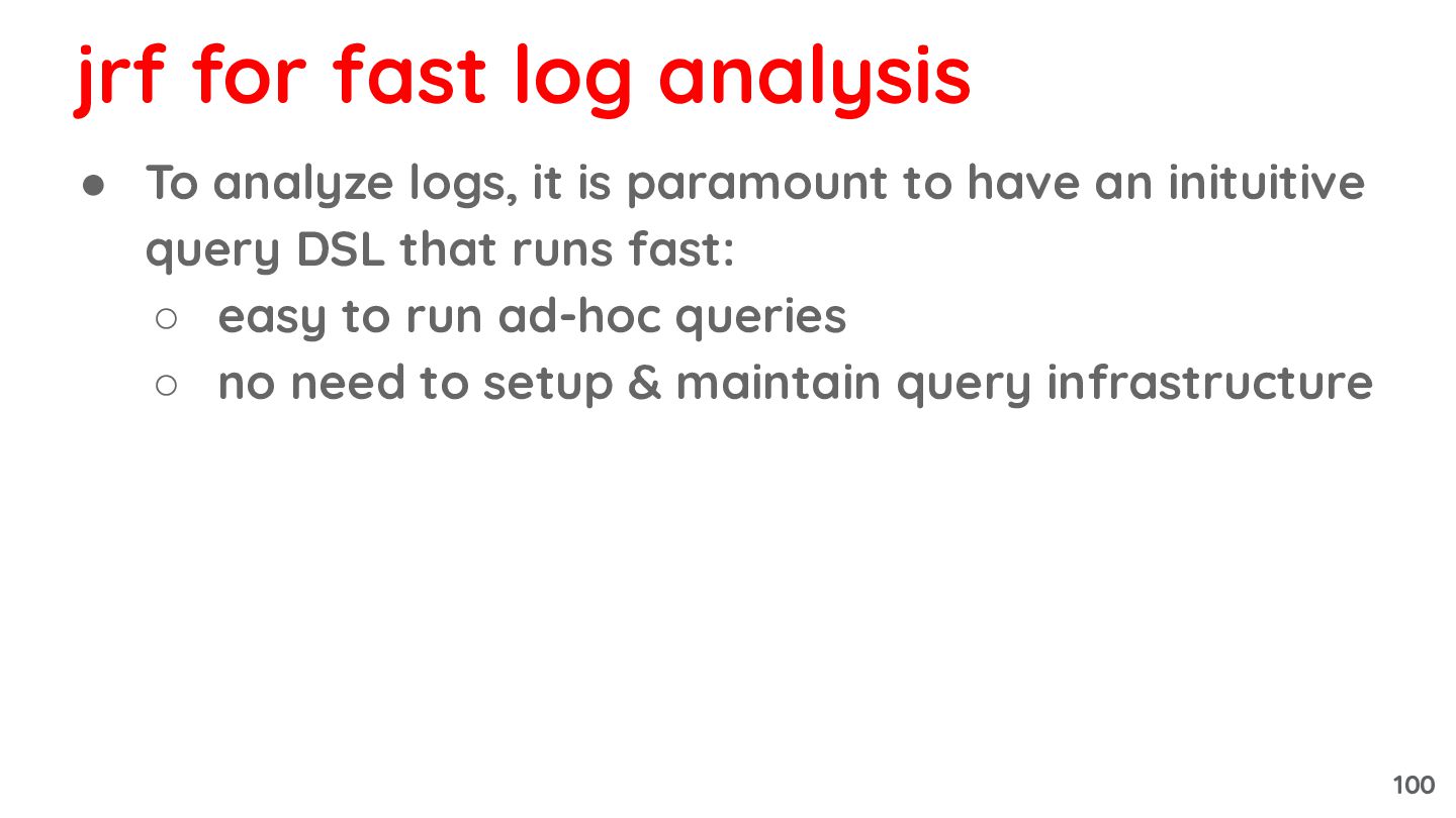inituitive query DSL that runs fast: ◦ easy to run ad-hoc queries ◦ no need to setup & maintain query infrastructure jrf for fast log analysis 100