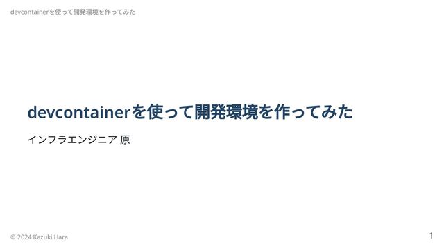 プラグインを入れたVisual Studio Code だけで良い。 開発環境はDocker コンテナ上に構築されるため、ローカル環境が汚れない。 Docker コンテナなので開発環境の作り直しが簡単。 事前ビルドされた開発環境コンテナイメージや、コンテナに機能を追加する feature が多数公開されており、少ない工数で開発環境コンテナを作ることができ る。 Docker コンテナの構成情報をコードで記述するため、開発環境の共有が簡単。 devcontainer を使って開発環境を作ってみた © 2024 Kazuki Hara 12