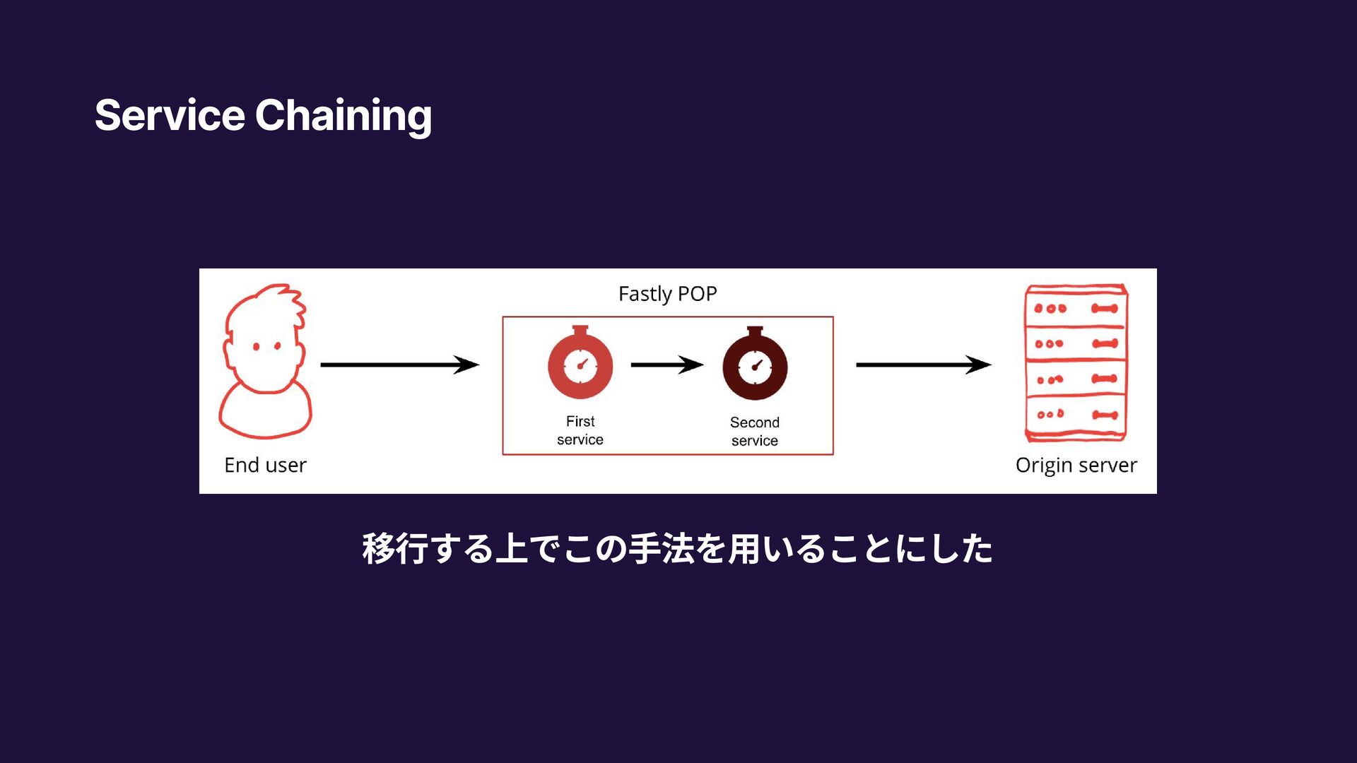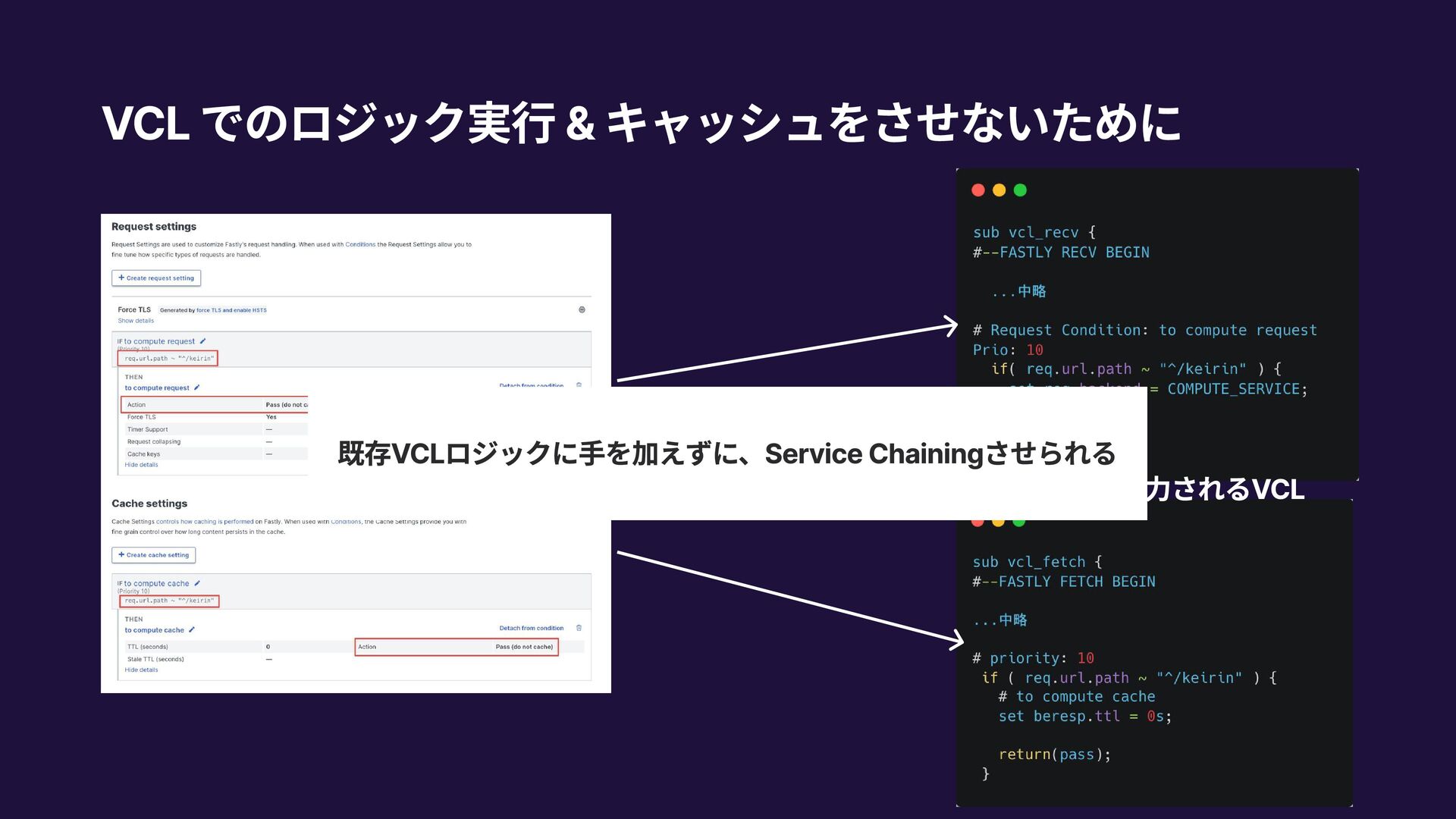 VCL でのロジック実行 & キャッシュをさせないために 既存VCLロジックに手を加えずに、Service Chainingさせられる 最終的に出力されるVCL
