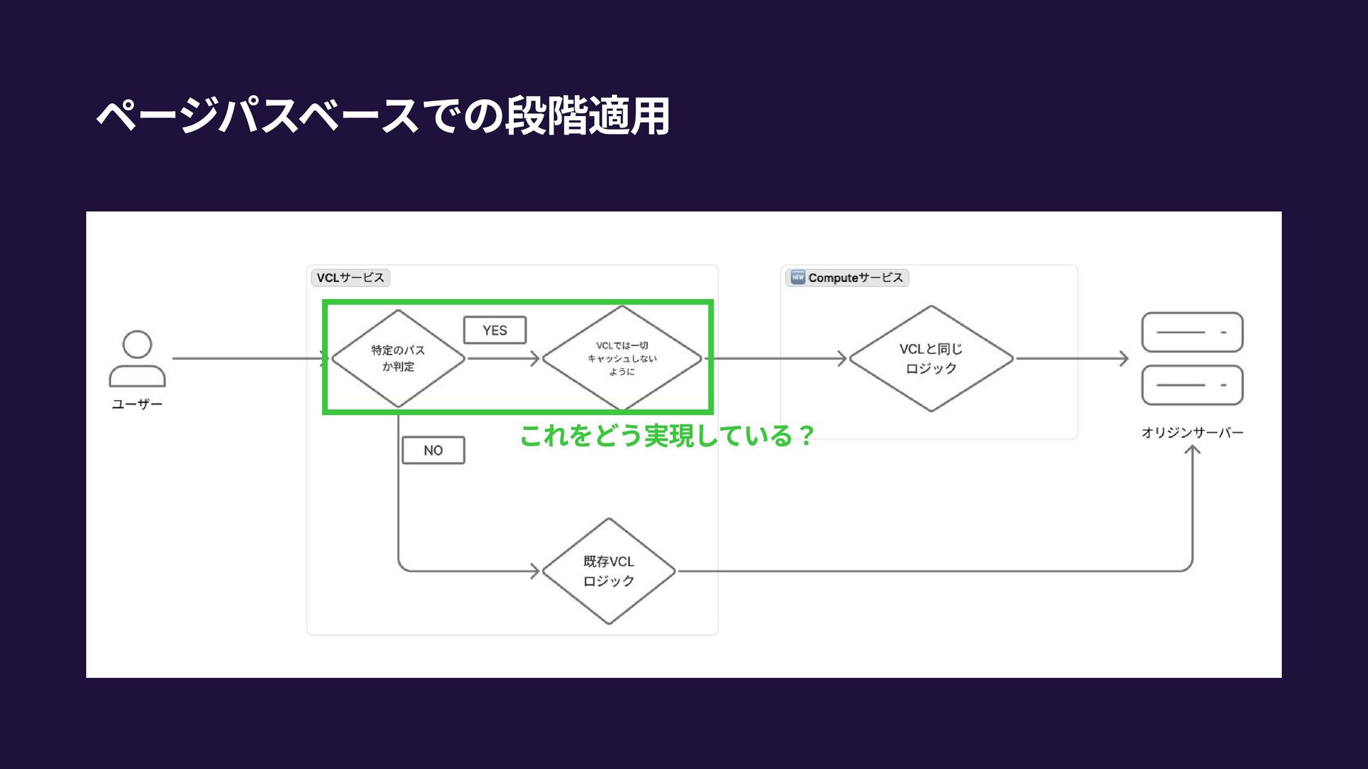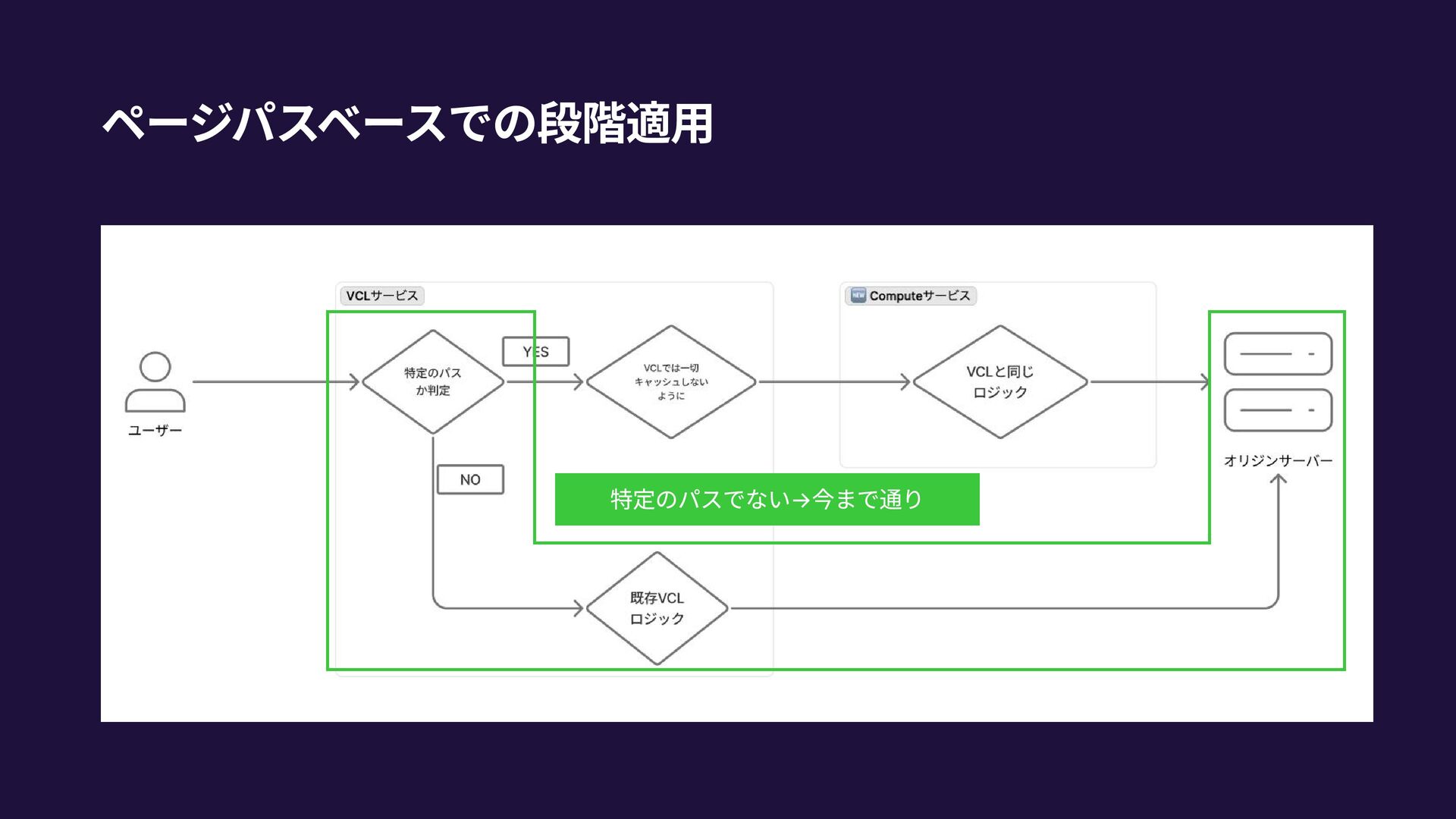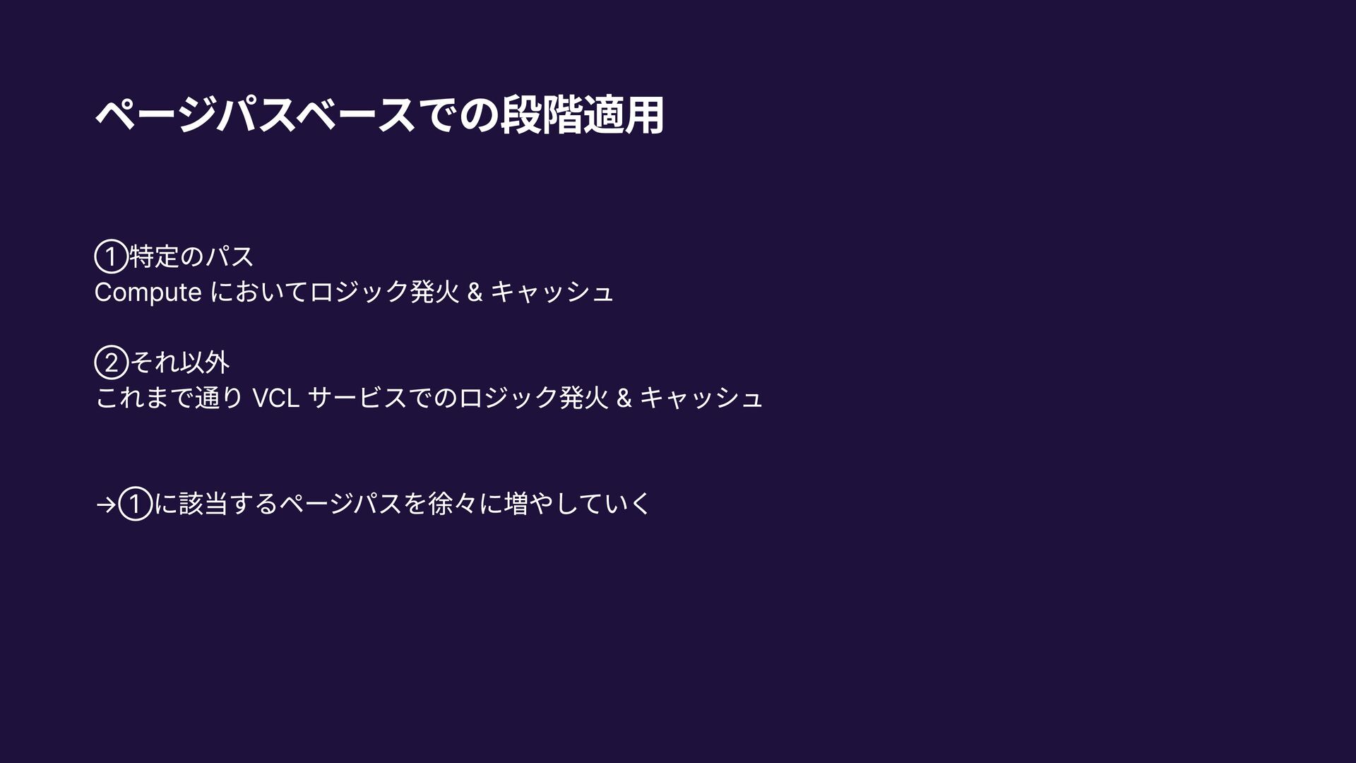 ページパスベースでの段階適用 ①特定のパス Compute においてロジック発火 & キャッシュ ②それ以外 これまで通り VCL サービスでのロジック発火