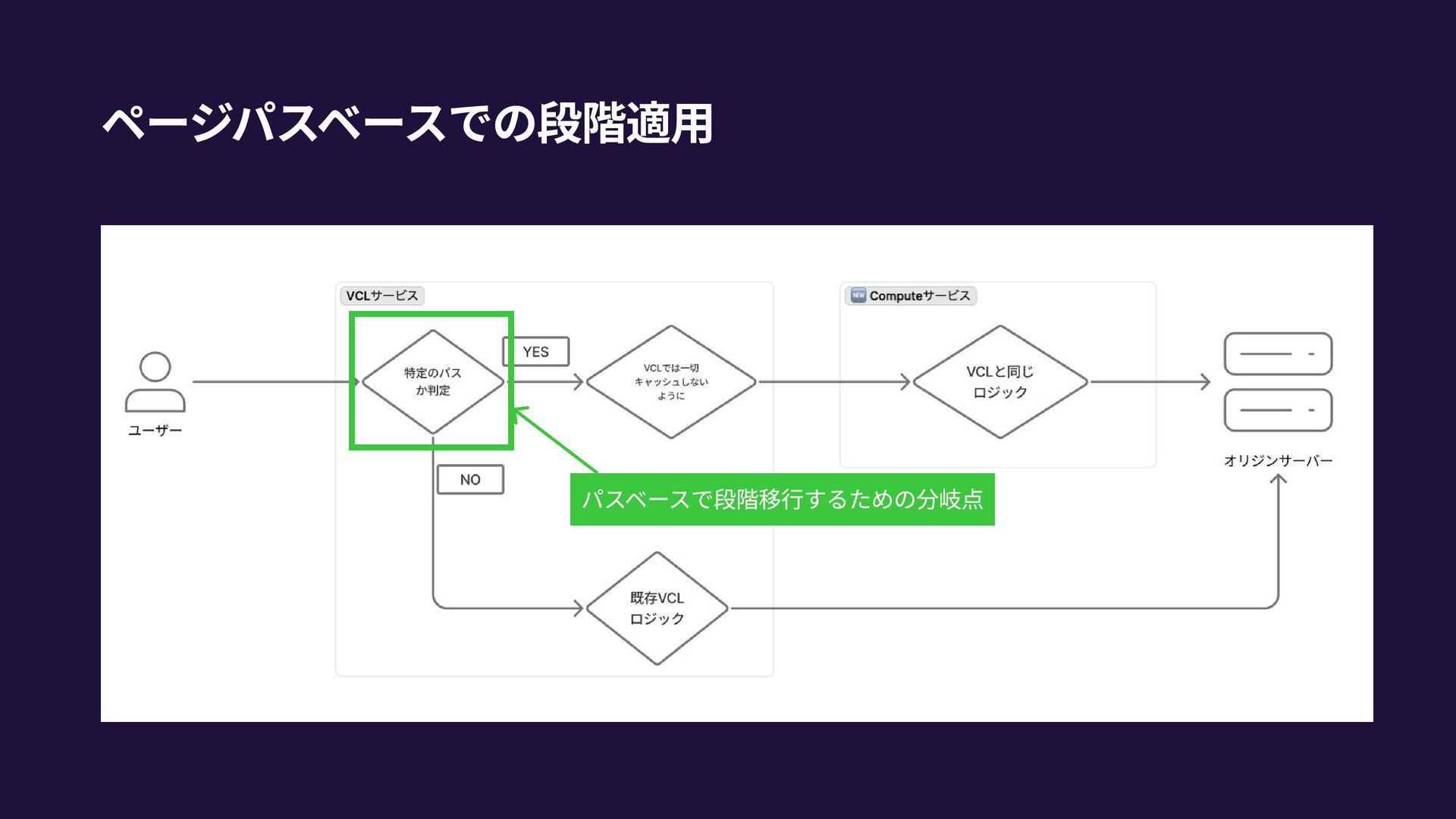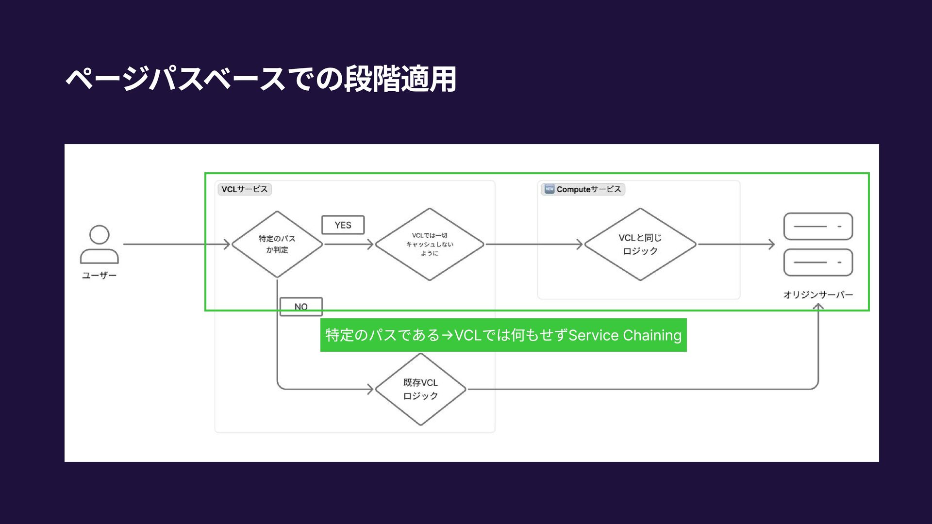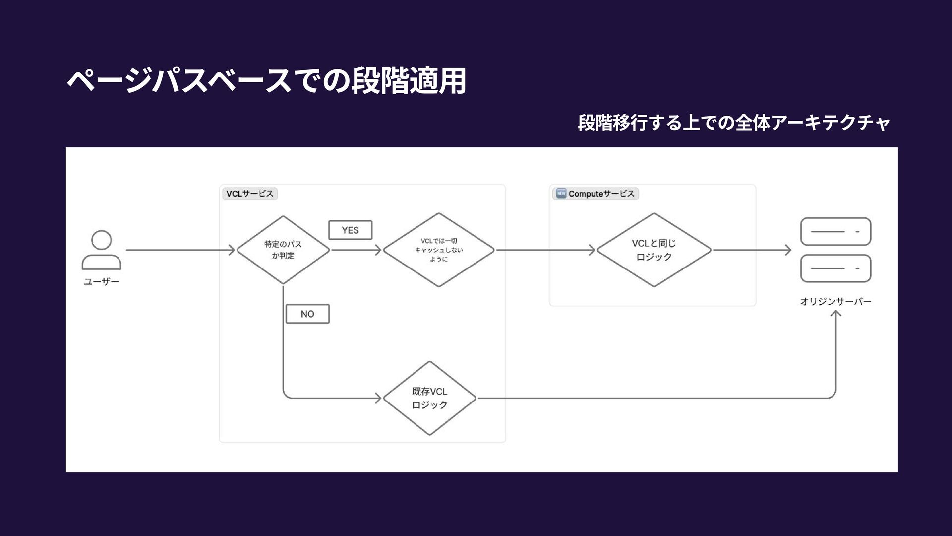 ページパスベースでの段階適用 ①特定のパス Compute においてロジック発火 & キャッシュ ②それ以外 これまで通り VCL サービスでのロジック発火