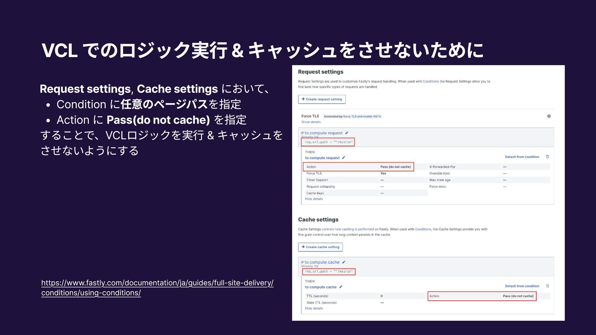 に任意のページパスを指定 Action に Pass(do not cache) を指定 することで、VCLロジックを実行 & キャッシュを させないようにする https://www.fastly.com/documentation/ja/guides/full-site-delivery/ conditions/using-conditions/