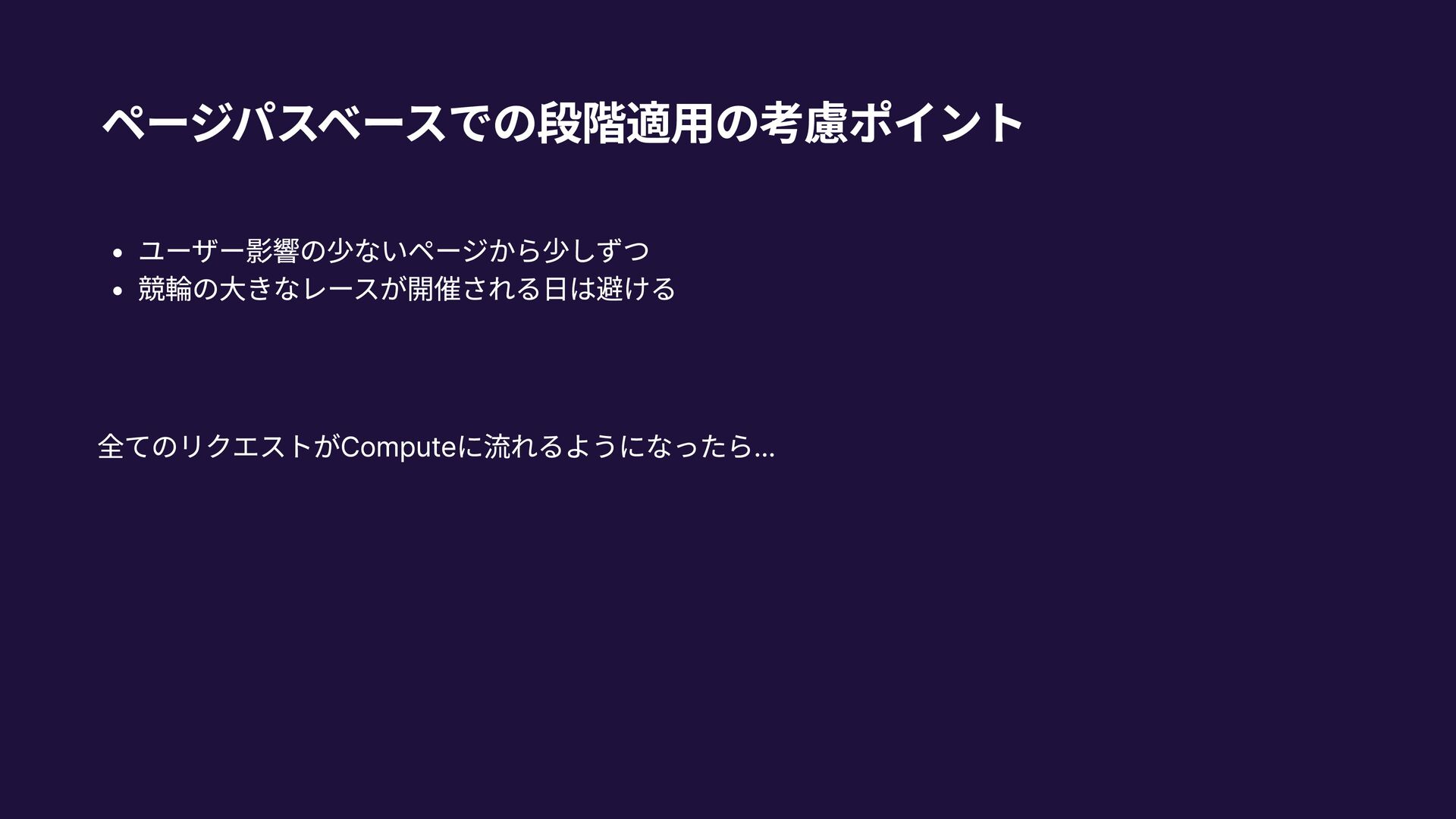 ページパスベースでの段階適用の考慮ポイント ユーザー影響の少ないページから少しずつ 競輪の大きなレースが開催される日は避ける 全てのリクエストがComputeに流れるようになったら...