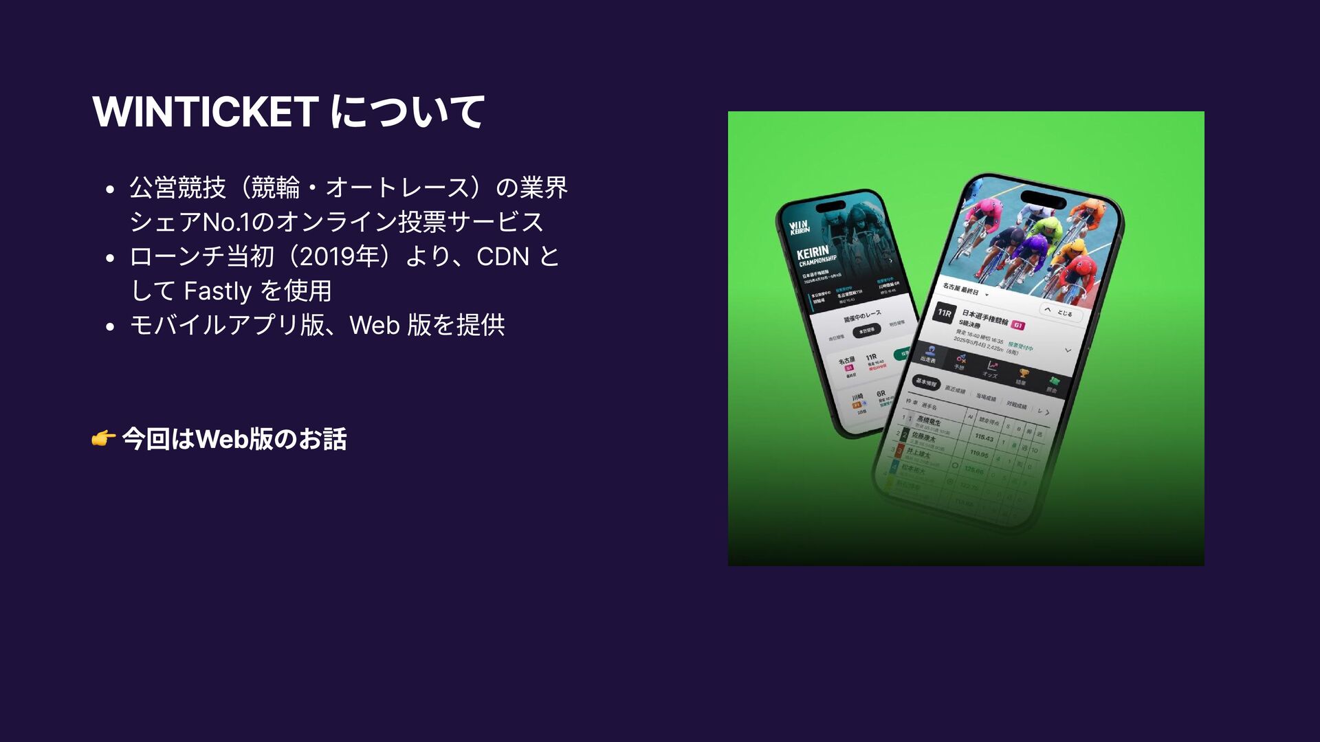 WINTICKET について 公営競技(競輪・オートレース)の業界 シェアNo.1のオンライン投票サービス ローンチ当初(2019年)より、CDN と して Fastly を使用 モバイルアプリ版、Web