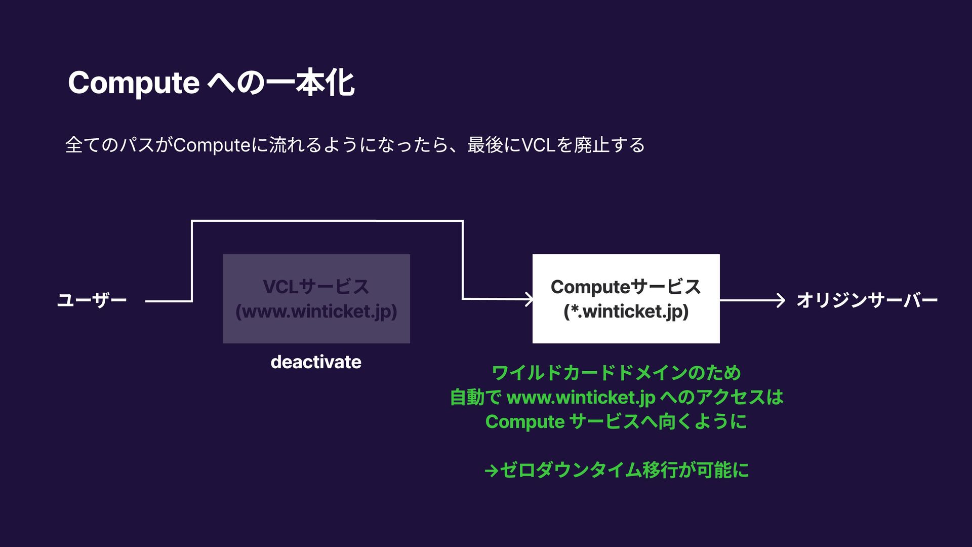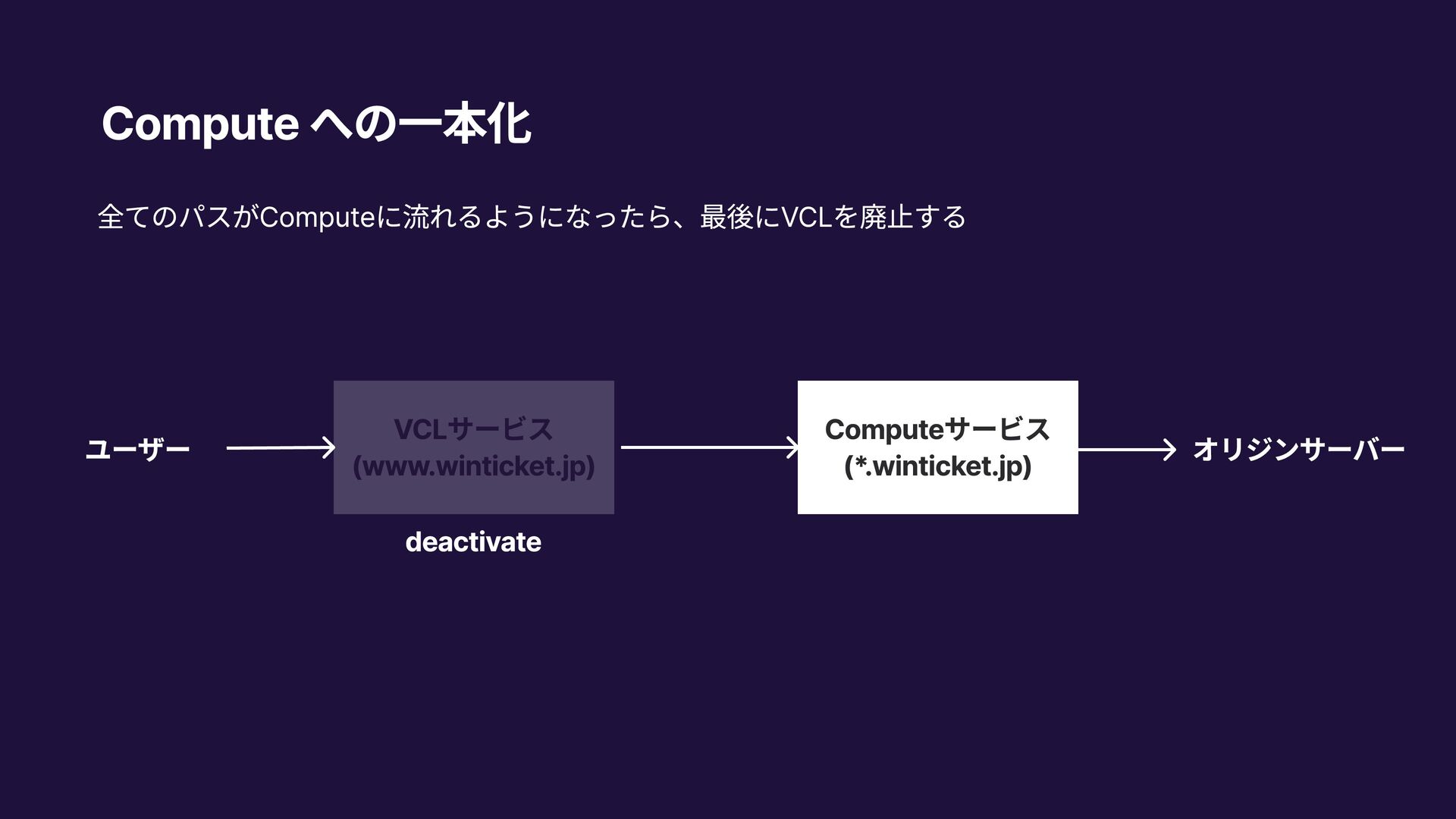 Compute への一本化 全てのパスがComputeに流れるようになったら、最後にVCLを廃止する VCLサービス (www.winticket.jp) Computeサービス (*.winticket.jp) deactivate ユーザー オリジンサーバー