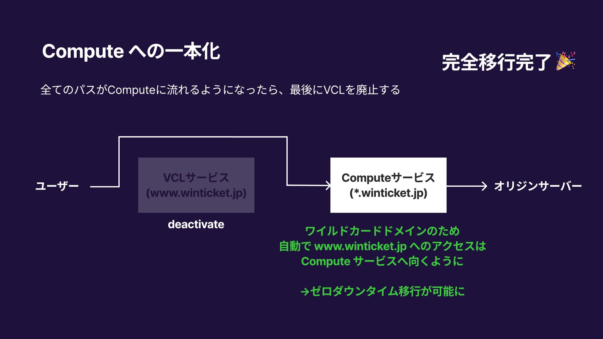 Compute への一本化 全てのパスがComputeに流れるようになったら、最後にVCLを廃止する VCLサービス (www.winticket.jp) Computeサービス (*.winticket.jp) deactivate ユーザー ワイルドカードドメインのため