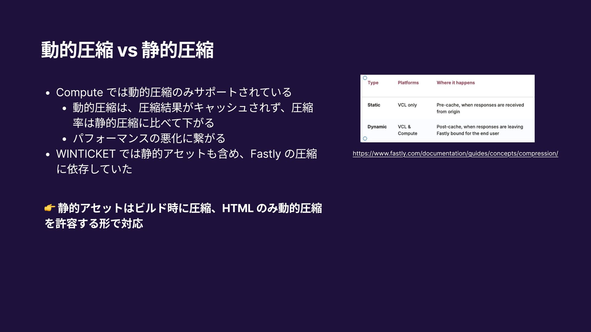 動的圧縮 vs 静的圧縮 Compute では動的圧縮のみサポートされている 動的圧縮は、圧縮結果がキャッシュされず、圧縮 率は静的圧縮に比べて下がる パフォーマンスの悪化に繋がる WINTICKET では静的アセットも含め、Fastly
