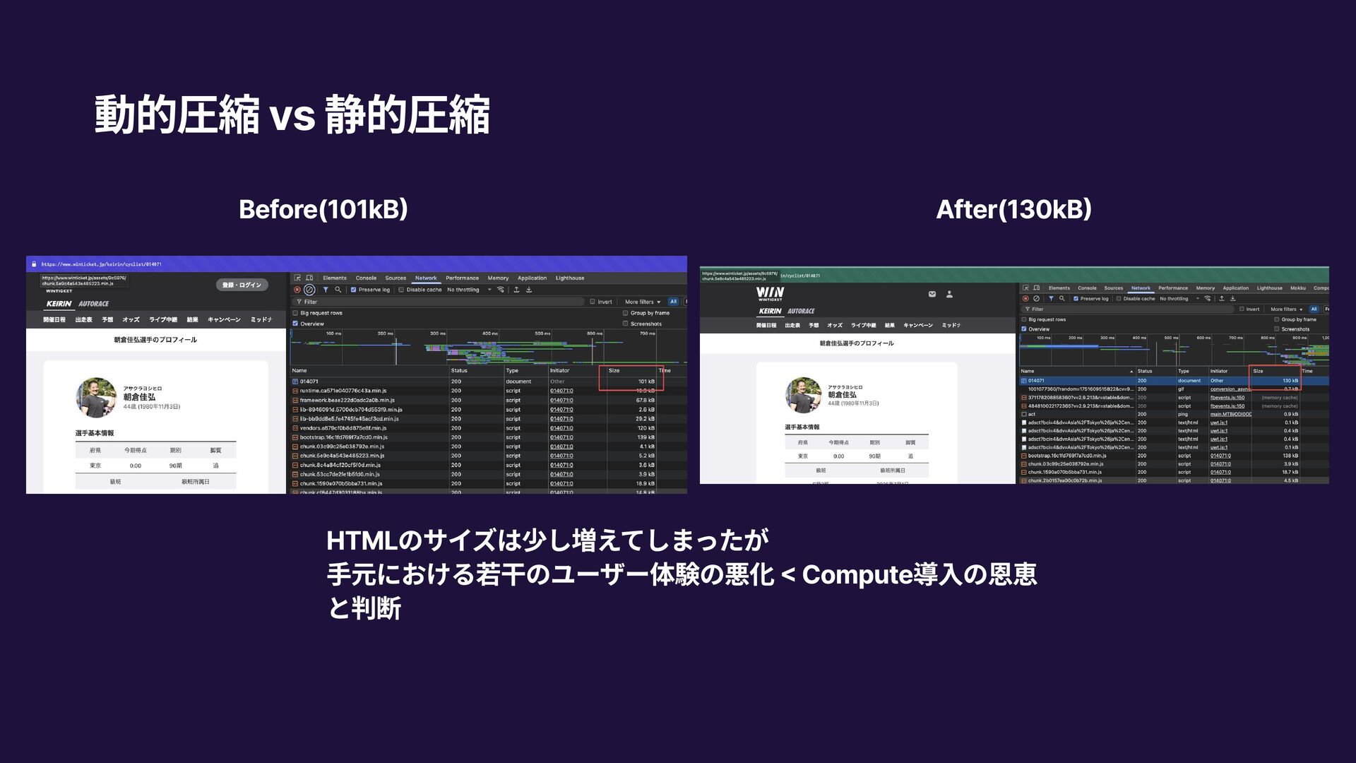 動的圧縮 vs 静的圧縮 Before(101kB) HTMLのサイズは少し増えてしまったが 手元における若干のユーザー体験の悪化 < Compute導入の恩恵 と判断 After(130kB)